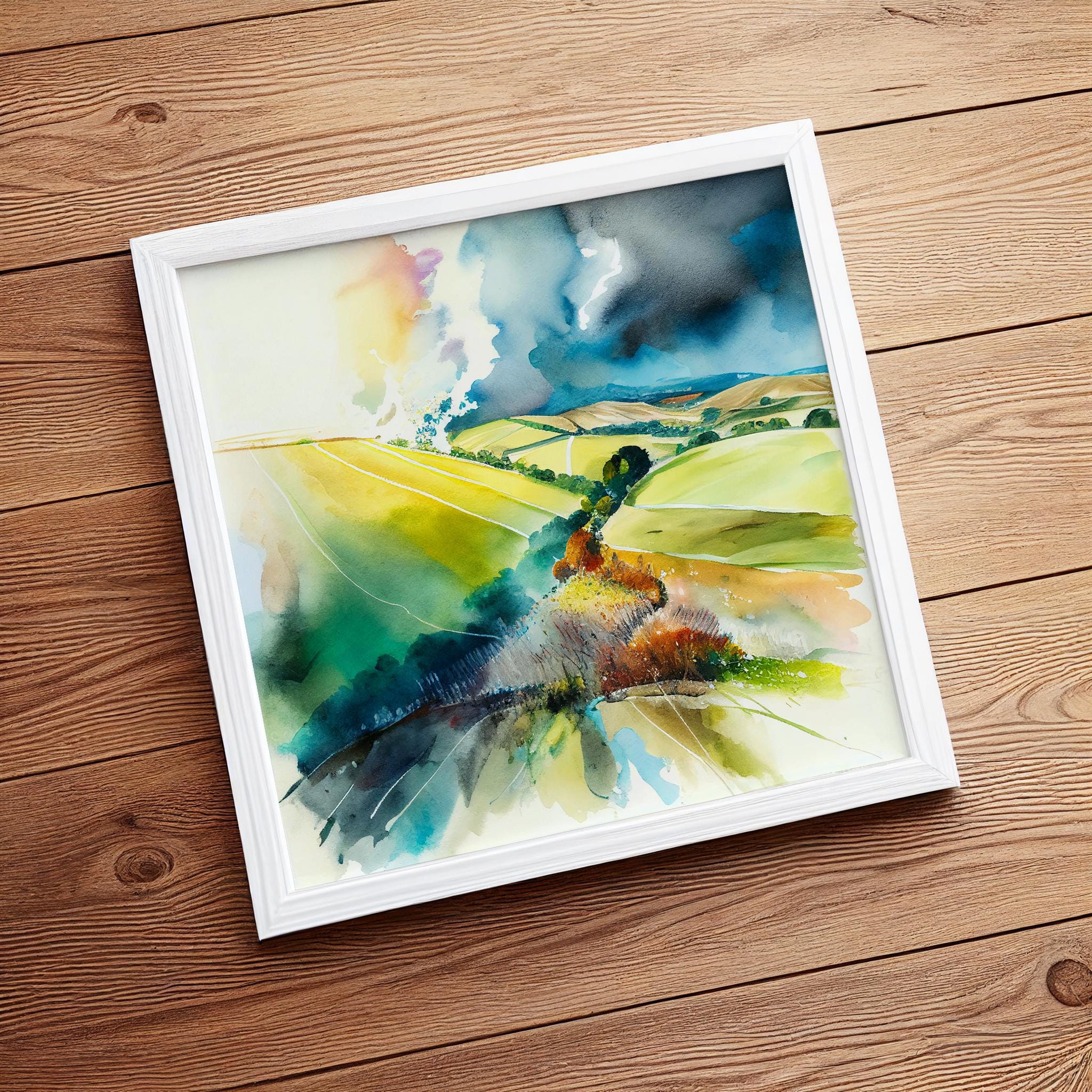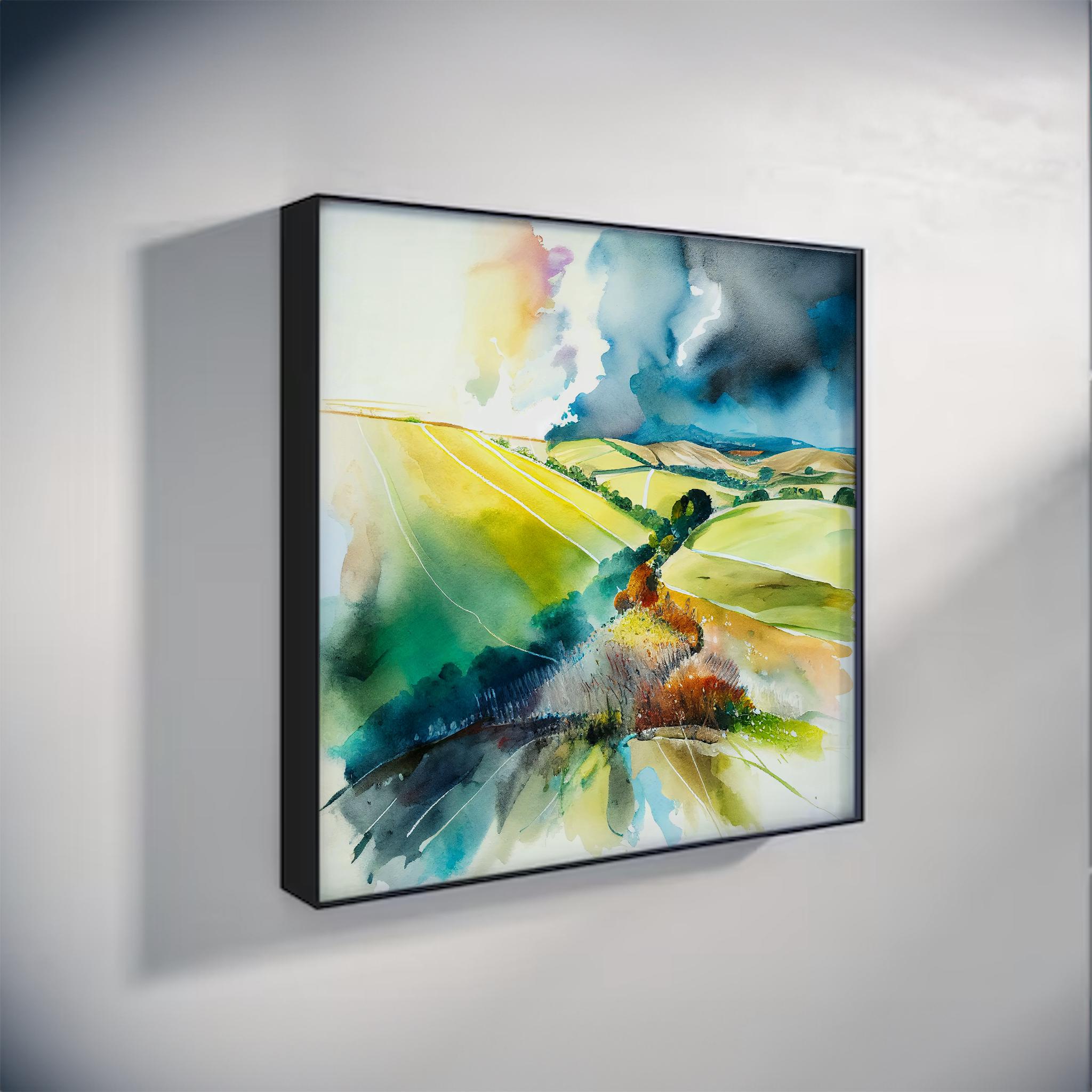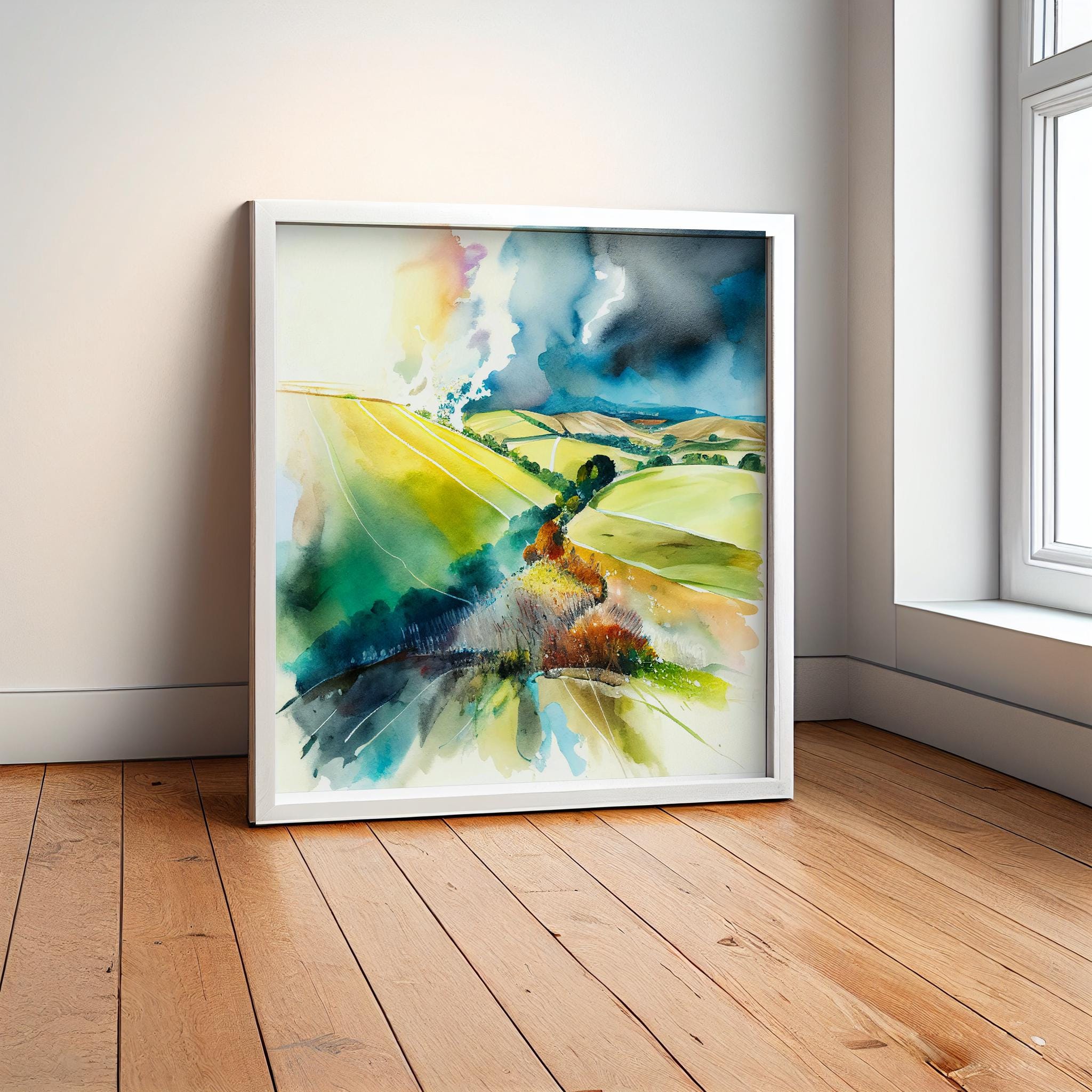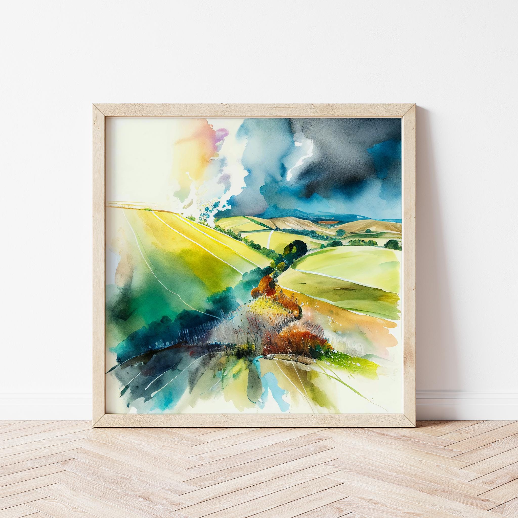 Abstract Landscape Watercolour Print of The Southdowns. I've tried to capture every seasons in one painting without being to literal. The trees in the mid ground are shown in various states of leaf and the colours around them suit the season they represent. The Southdowns National Park in the UK is constantly providing me with inspiration