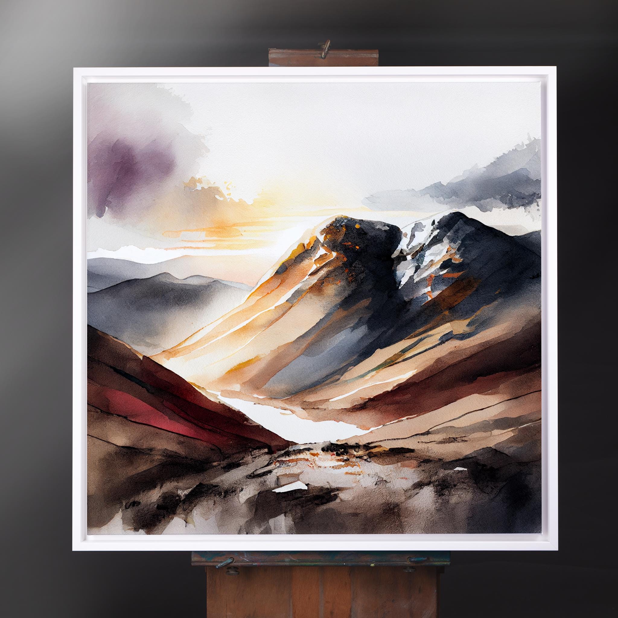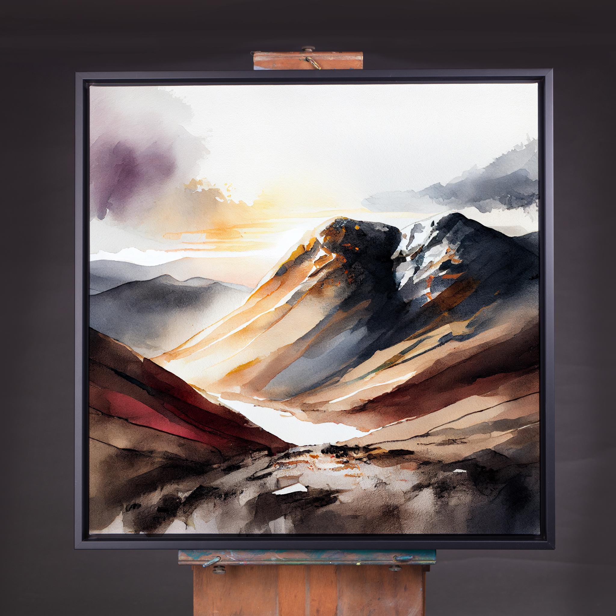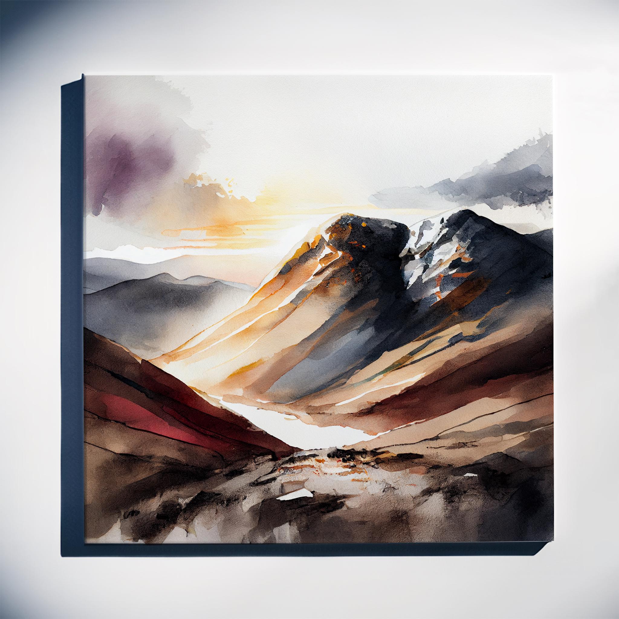 An abstract landscape print of Scafell Pike in the Lake District. These high-quality prints are produced on premium heavyweight watercolour paper or canvas, giving them a textured and authentic feel. The vibrant colours, broad brushstrokes and intricate details of this piece are sure to make a statement in any room. An ideal gift for any nature lover, or as a treat for yourself.