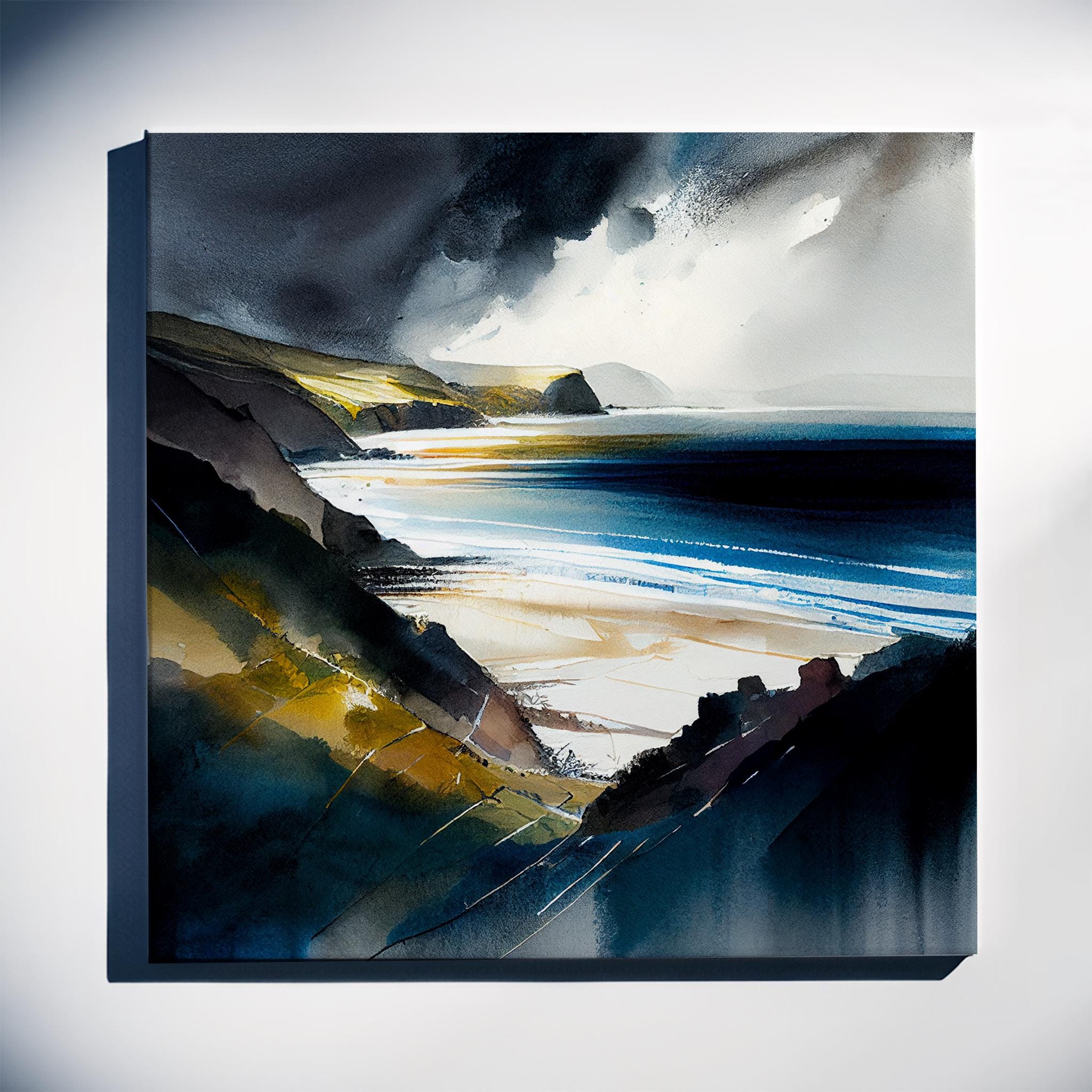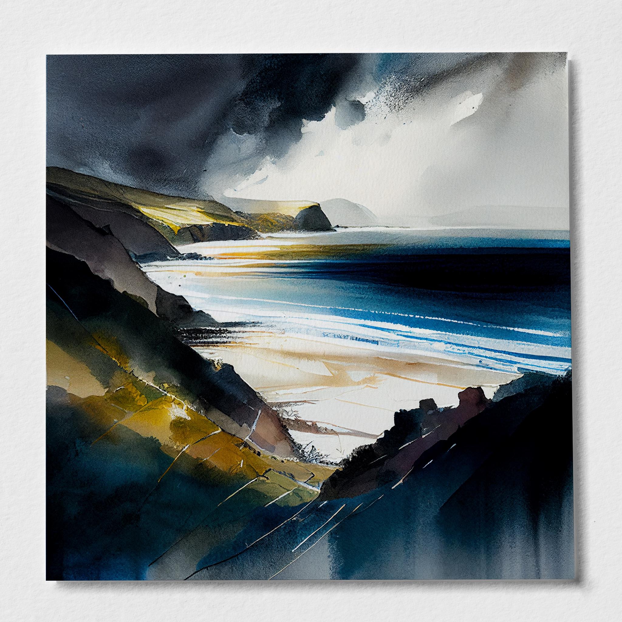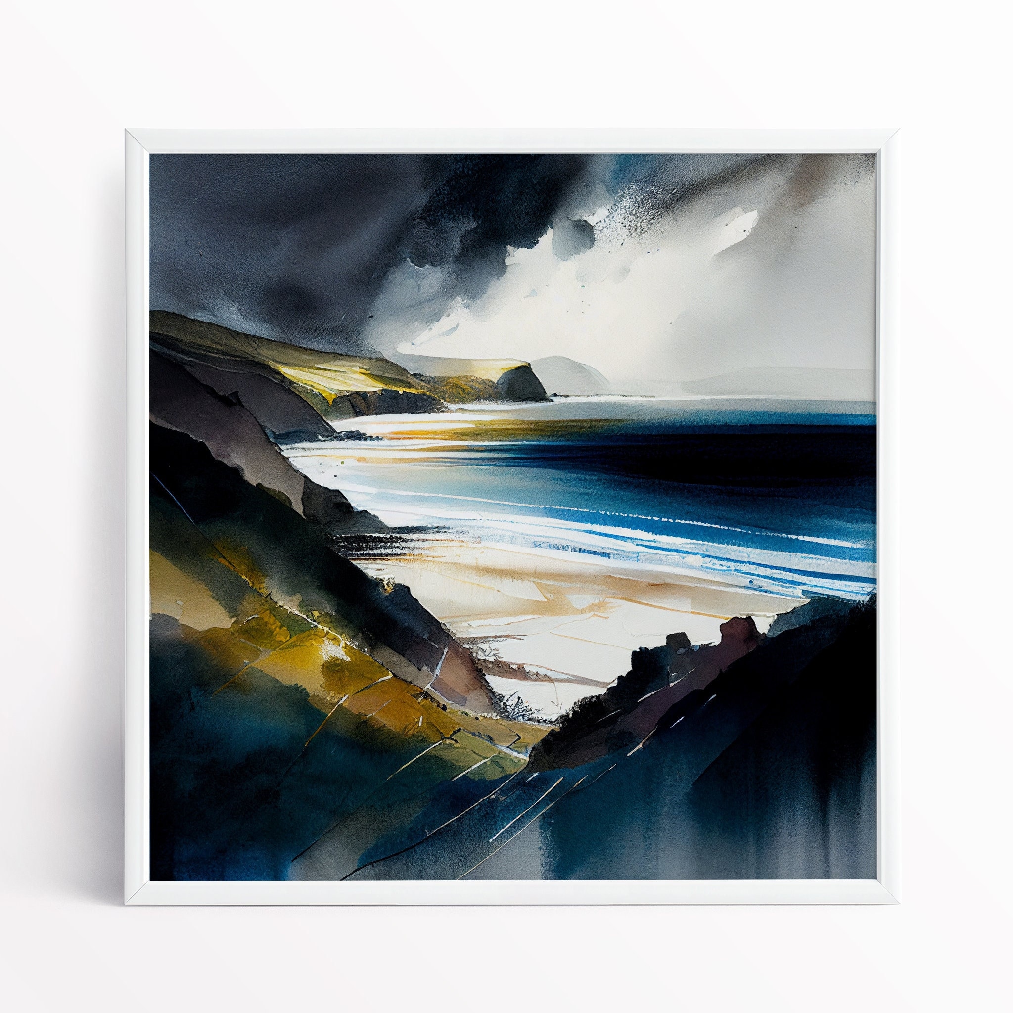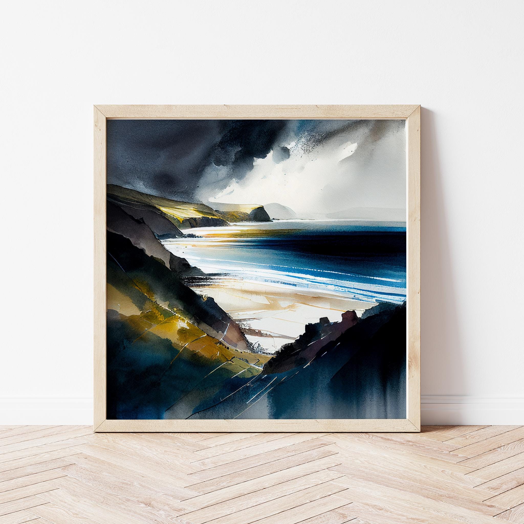 An abstract landscape print of Pembrokeshire Coast in Wales. High-quality prints produced on premium heavyweight watercolour paper or canvas, giving them a textured and authentic feel. The vibrant colours, broad brushstrokes and intricate details of this piece are sure to make a statement in any room.