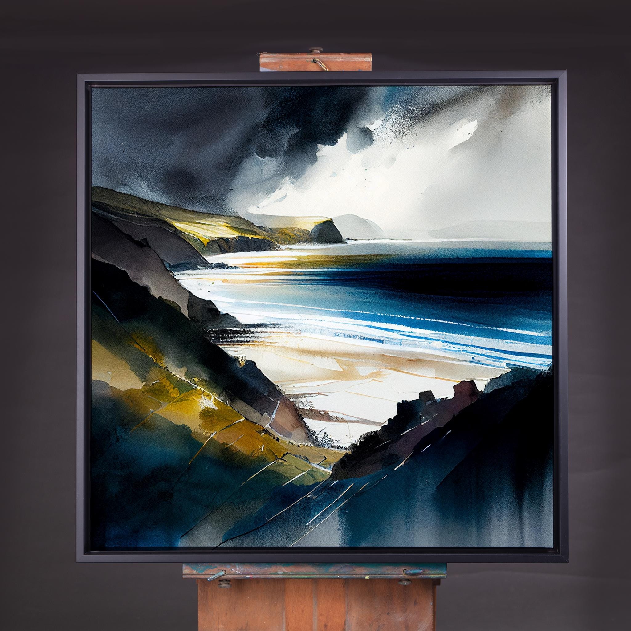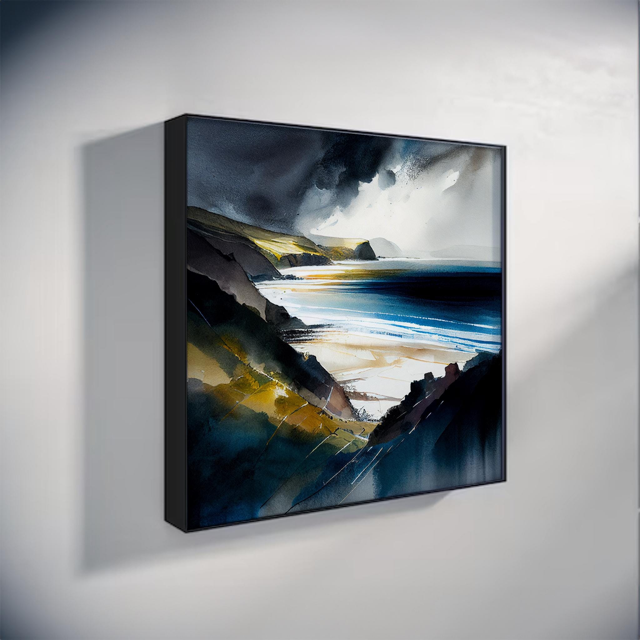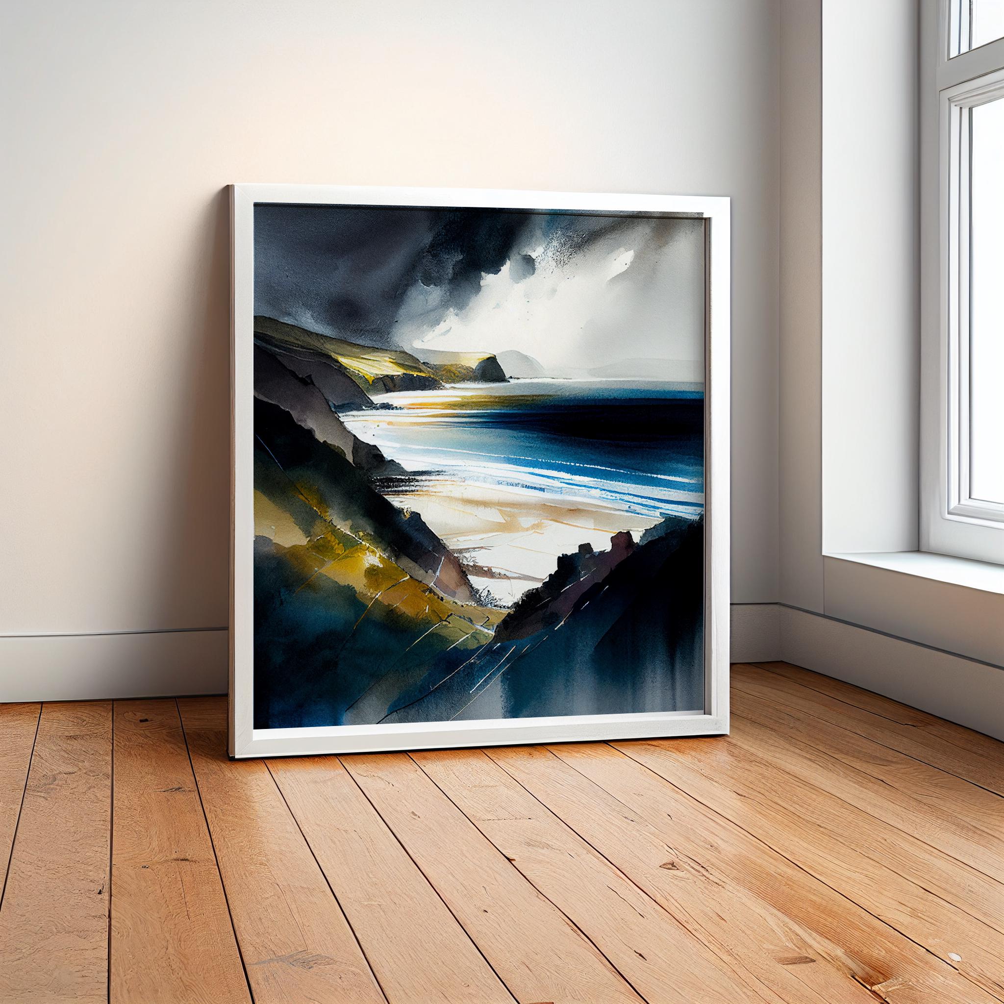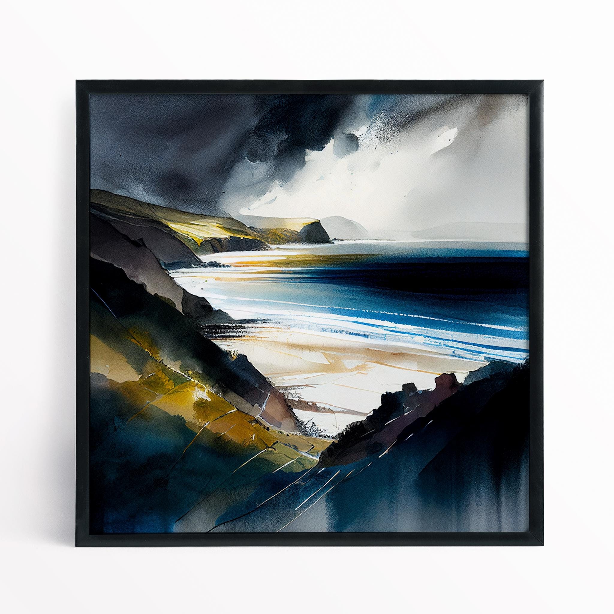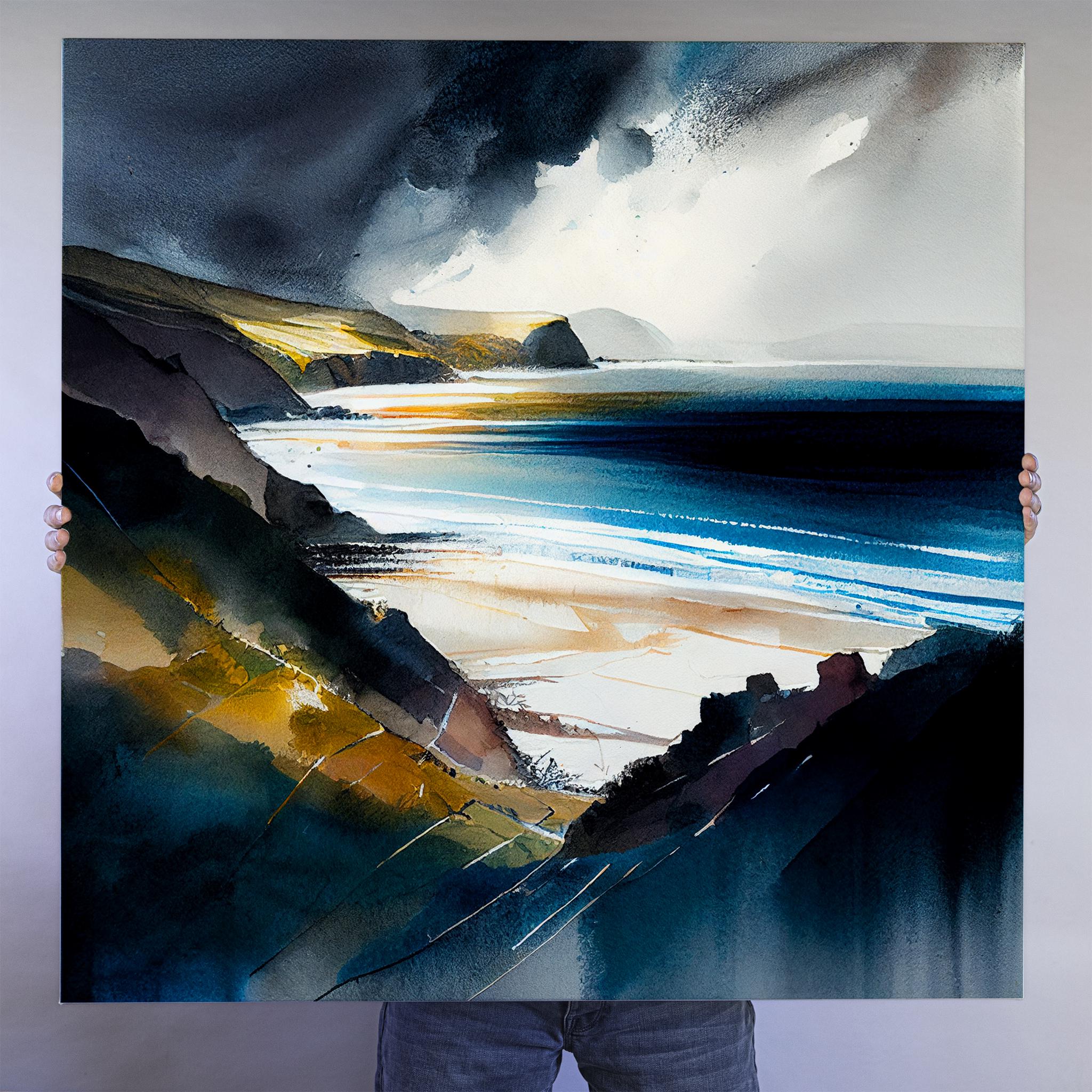 An abstract landscape print of Pembrokeshire Coast in Wales. High-quality prints produced on premium heavyweight watercolour paper or canvas, giving them a textured and authentic feel. The vibrant colours, broad brushstrokes and intricate details of this piece are sure to make a statement in any room.