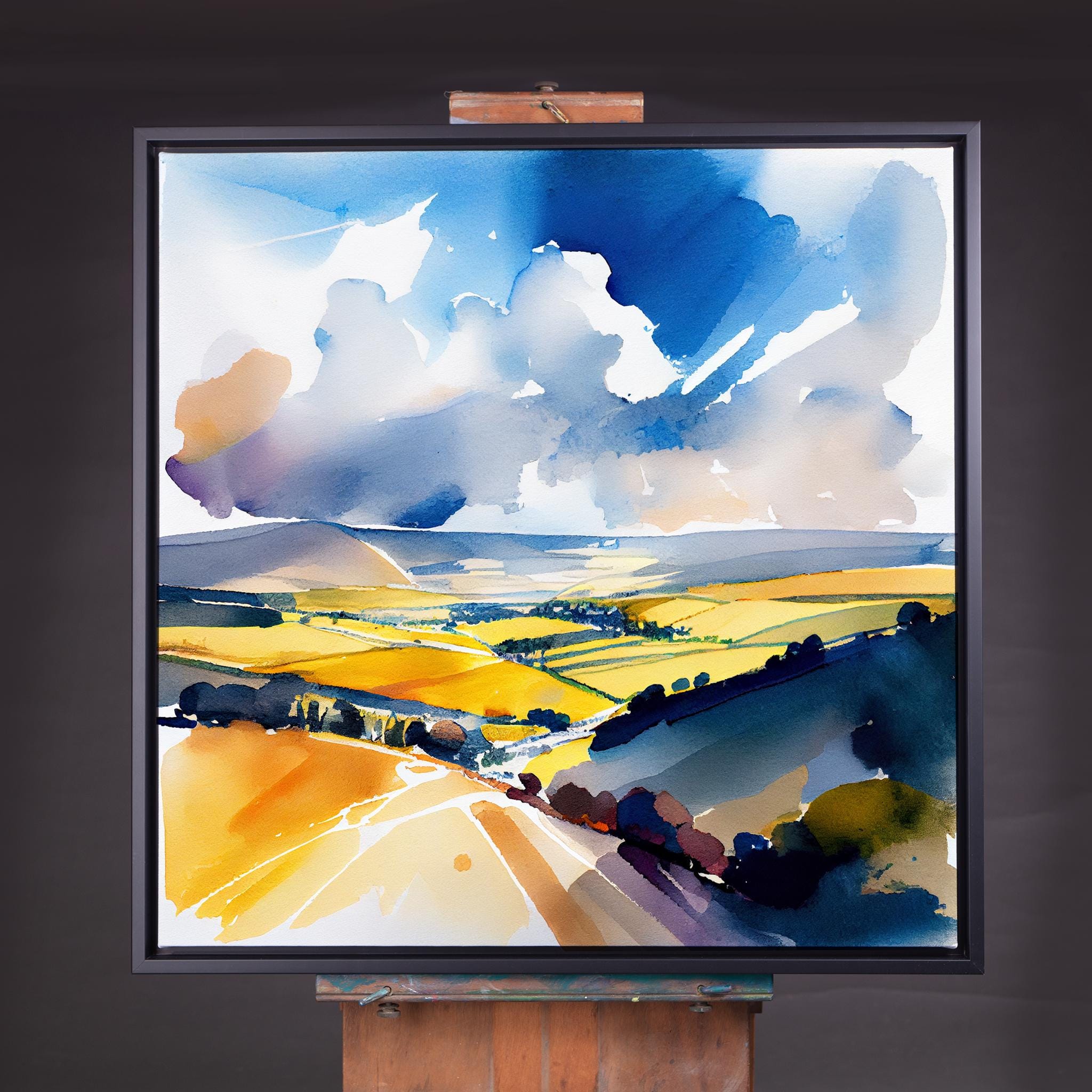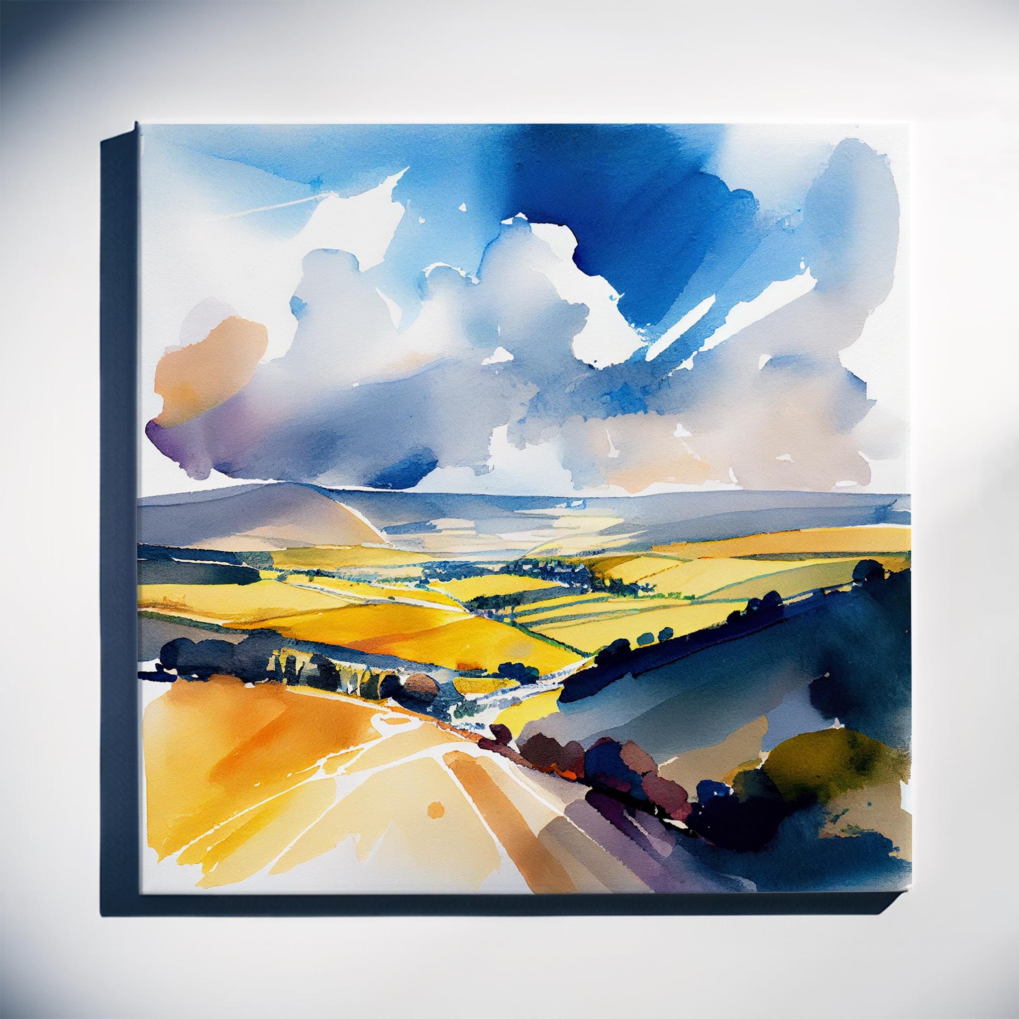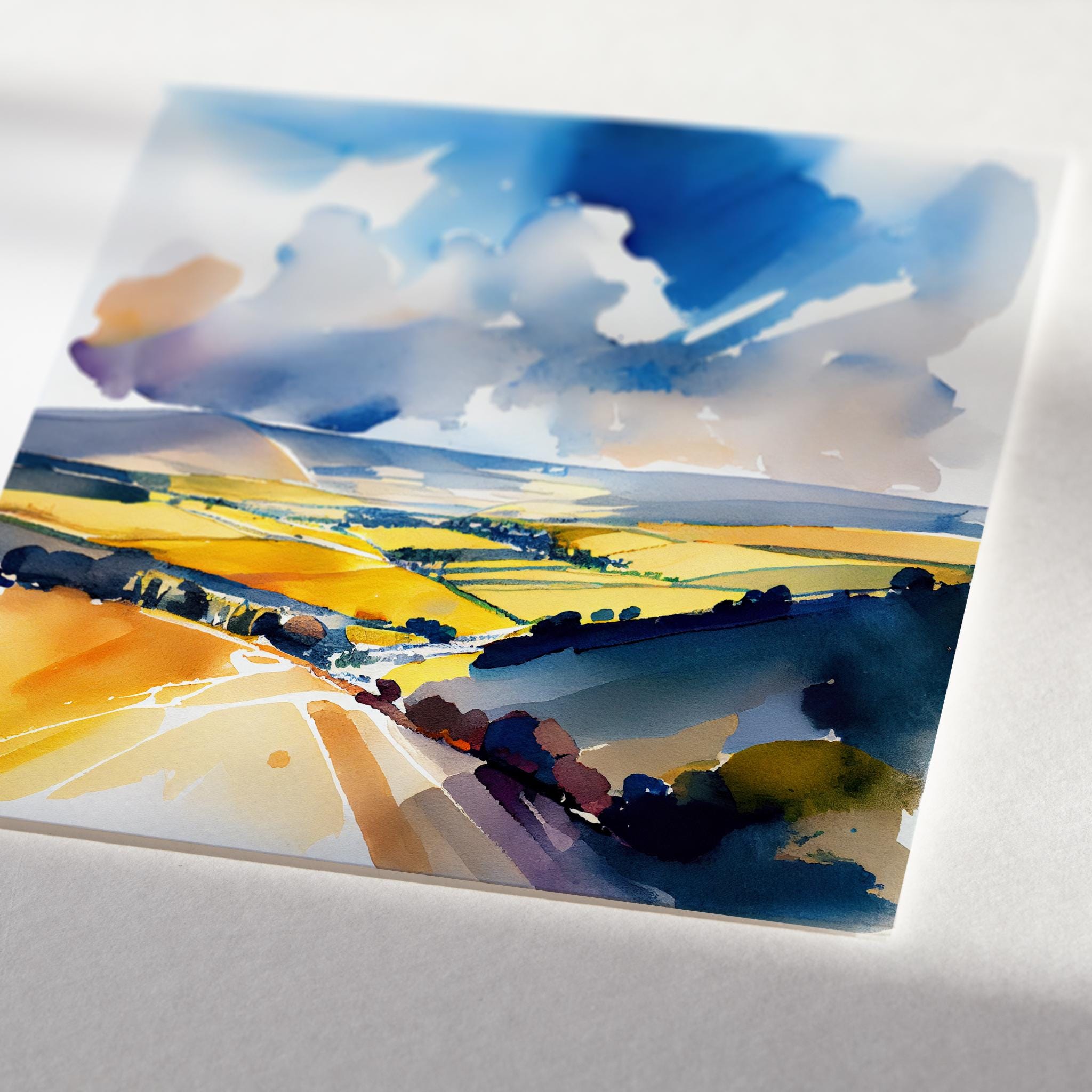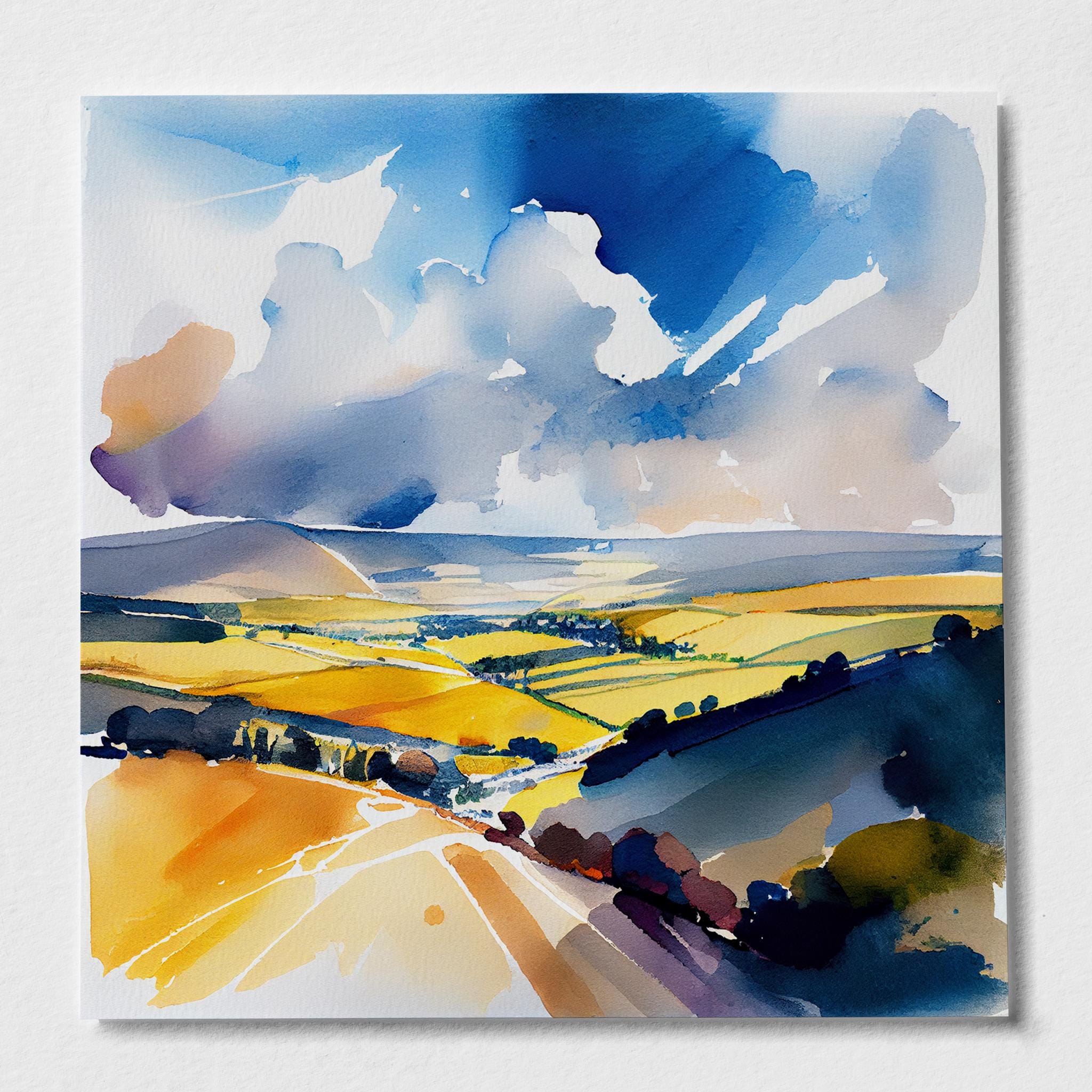 Abstract Landscape Watercolour Painting. An abstract landscape print of the original South Downs Painting. These high-quality prints are produced on premium heavy weight watercolour paper, giving them a textured and authentic feel. The vibrant colours, broad brushstrokes and intricate details of the painting are sure to make a statement in any room. An ideal gift for any nature lover, or as a treat for yourself.