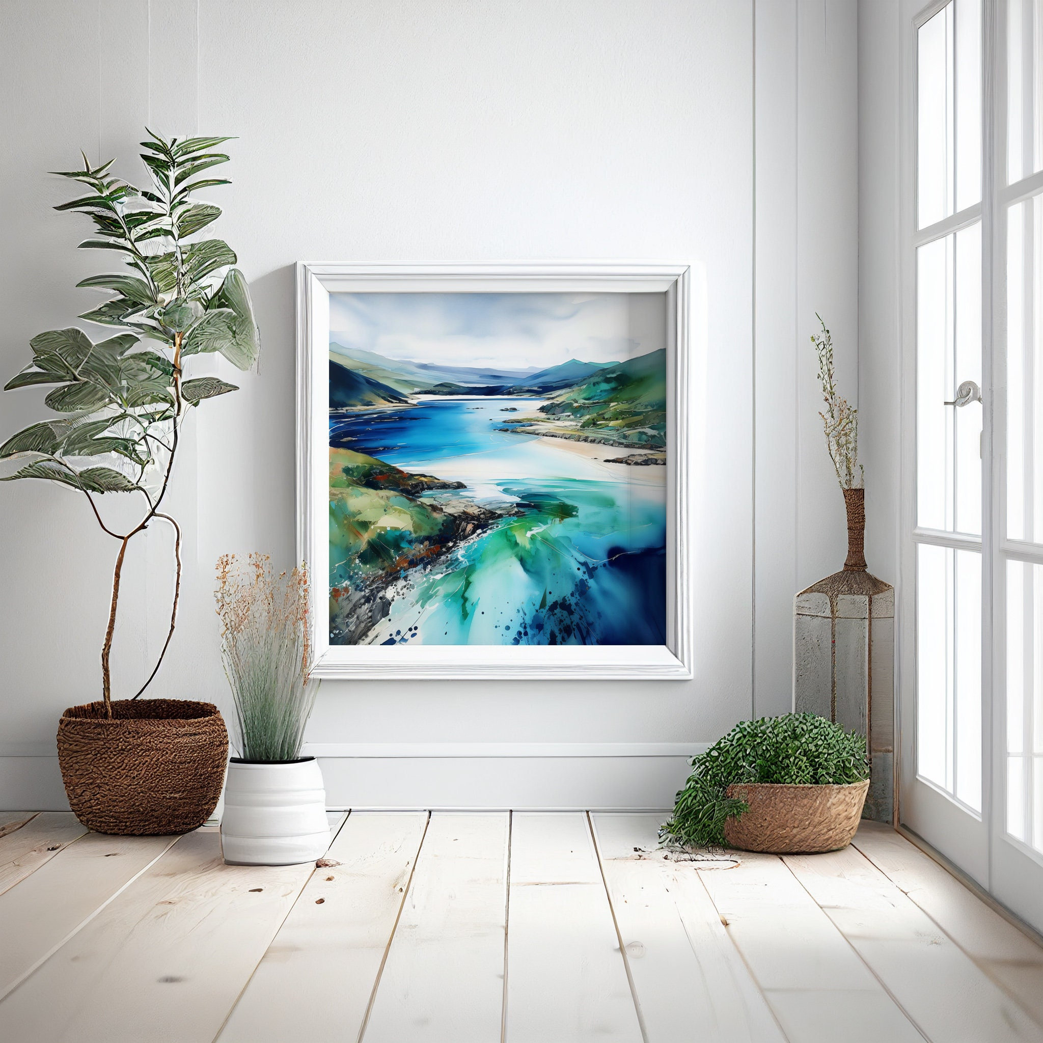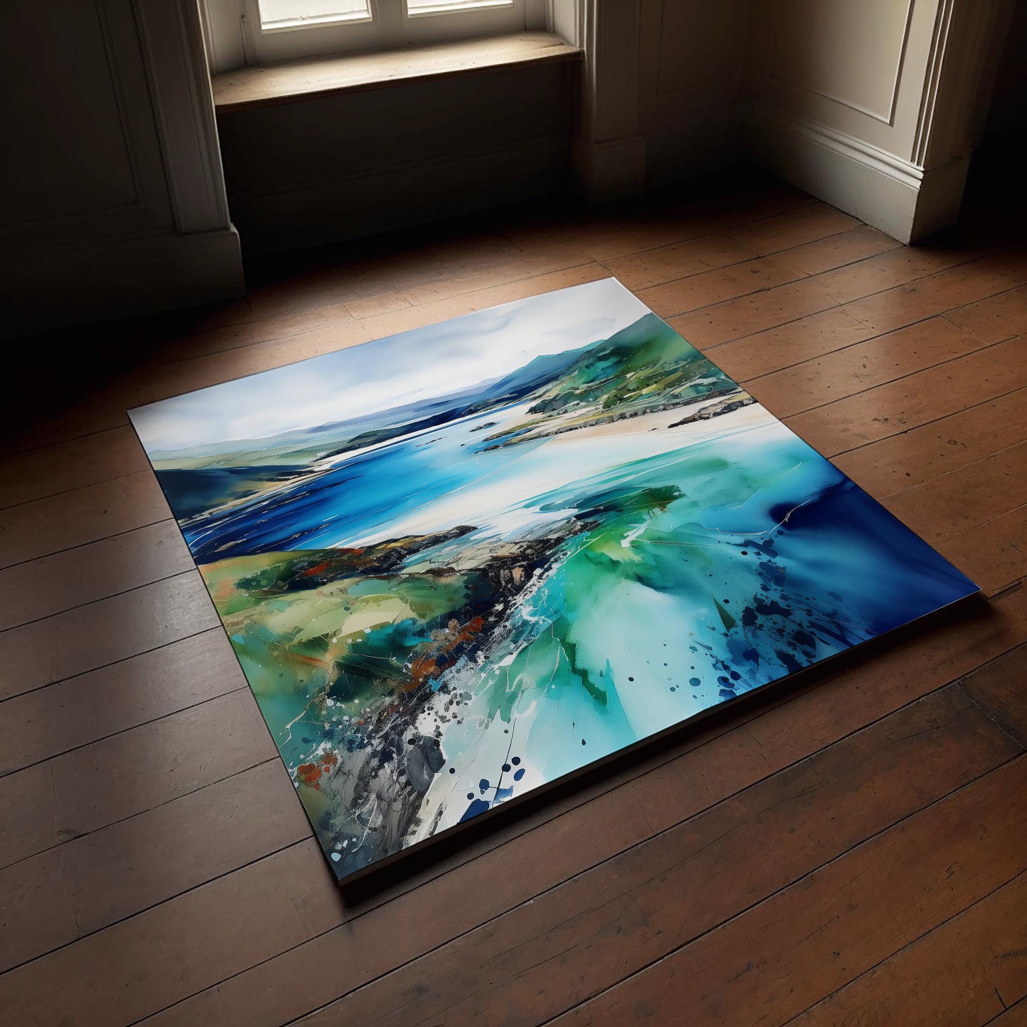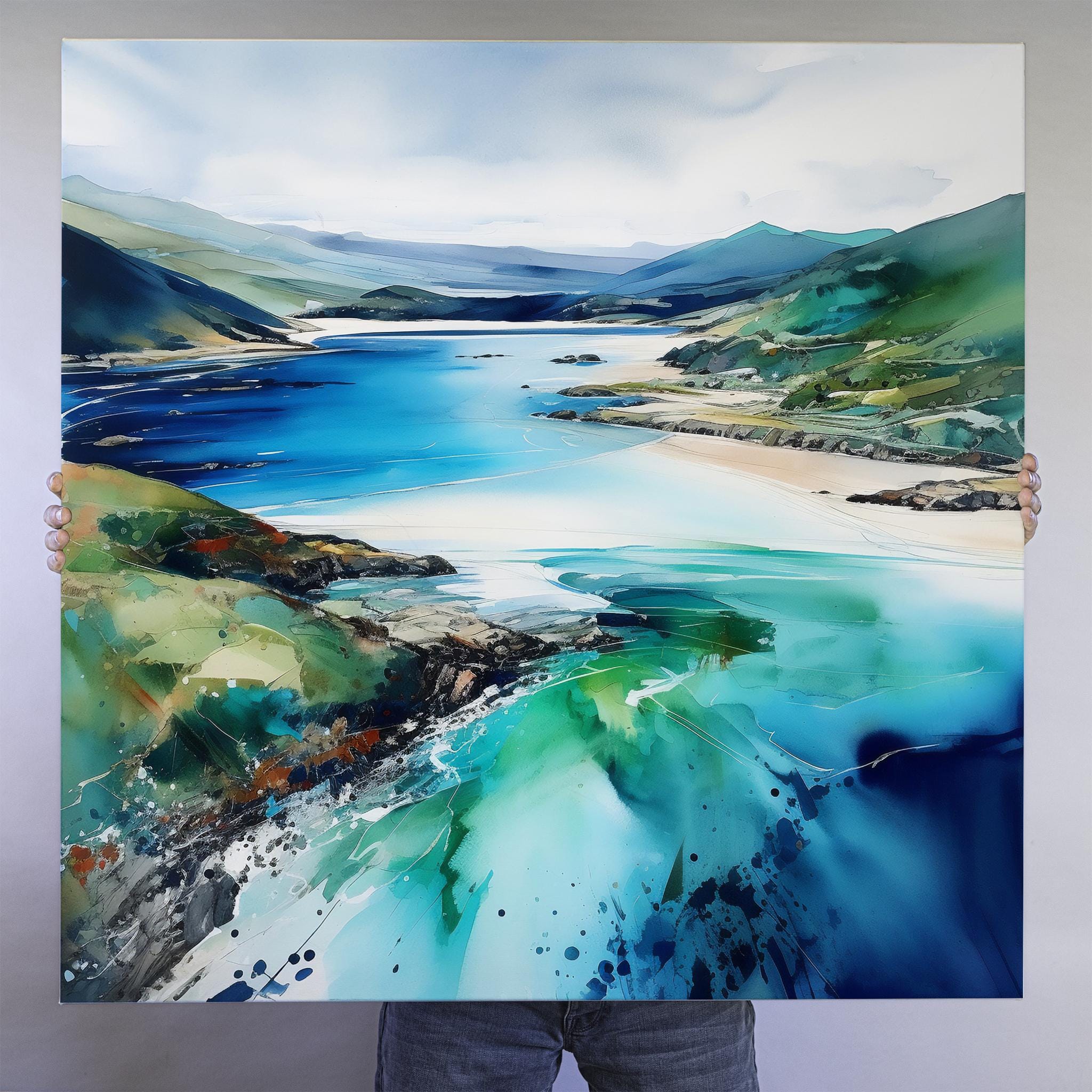 An abstract landscape print of Barmouth in Wales, Landscape Watercolour Painting. These high-quality prints are produced on premium heavyweight watercolour paper or canvas, giving them a textured and authentic feel. The vibrant colours, broad brushstrokes and intricate details of this piece are sure to make a statement in any room. An ideal gift for any nature lover, or as a treat for yourself.