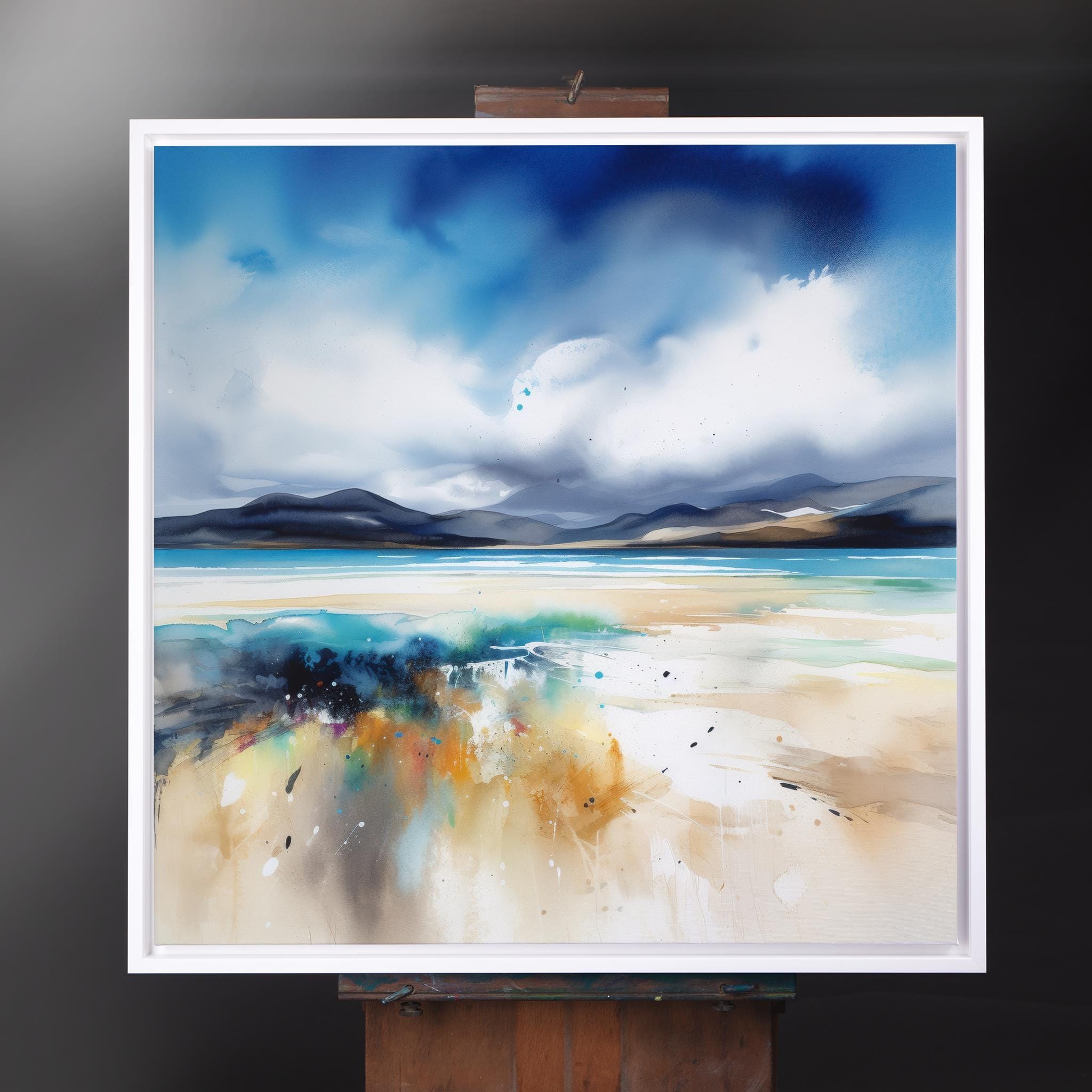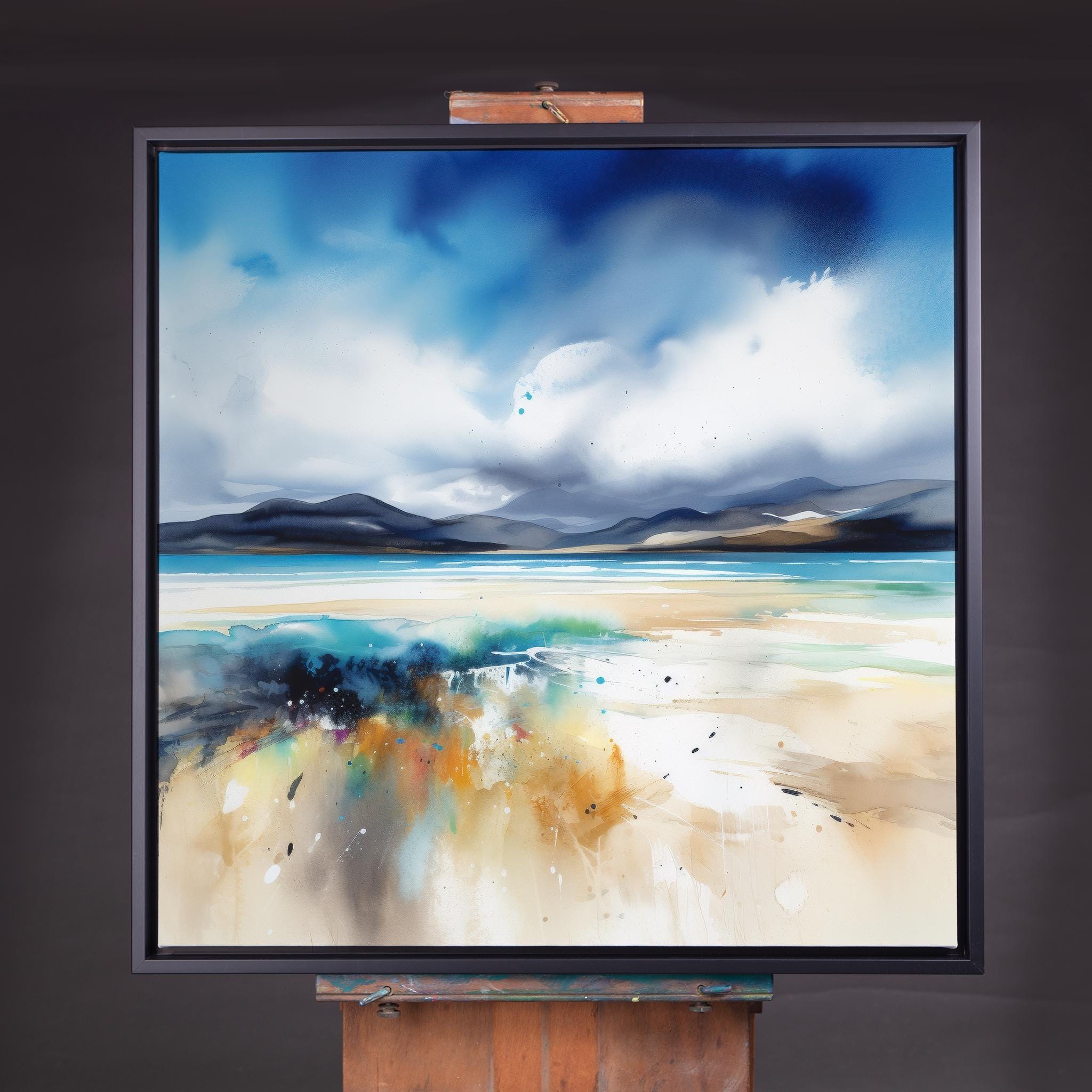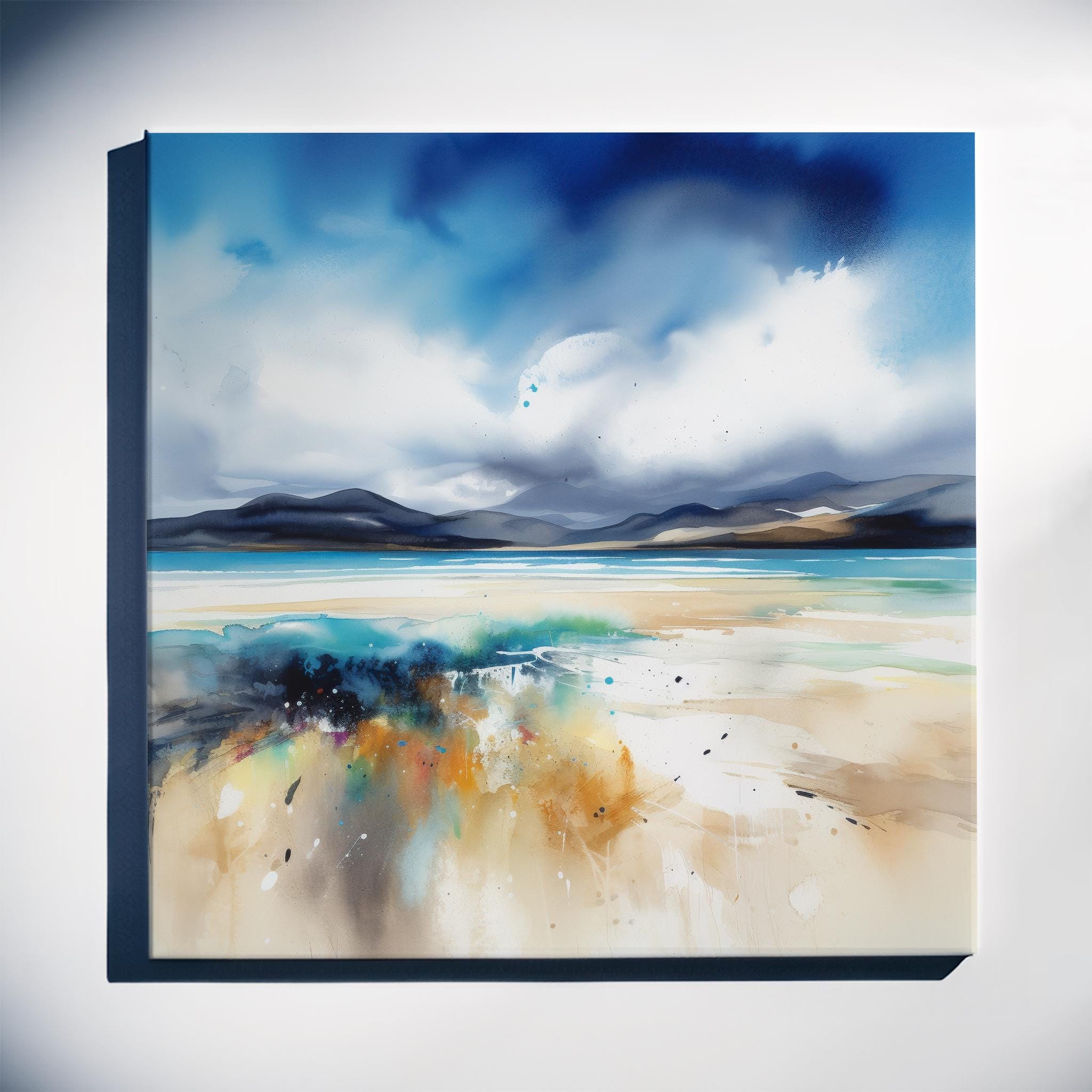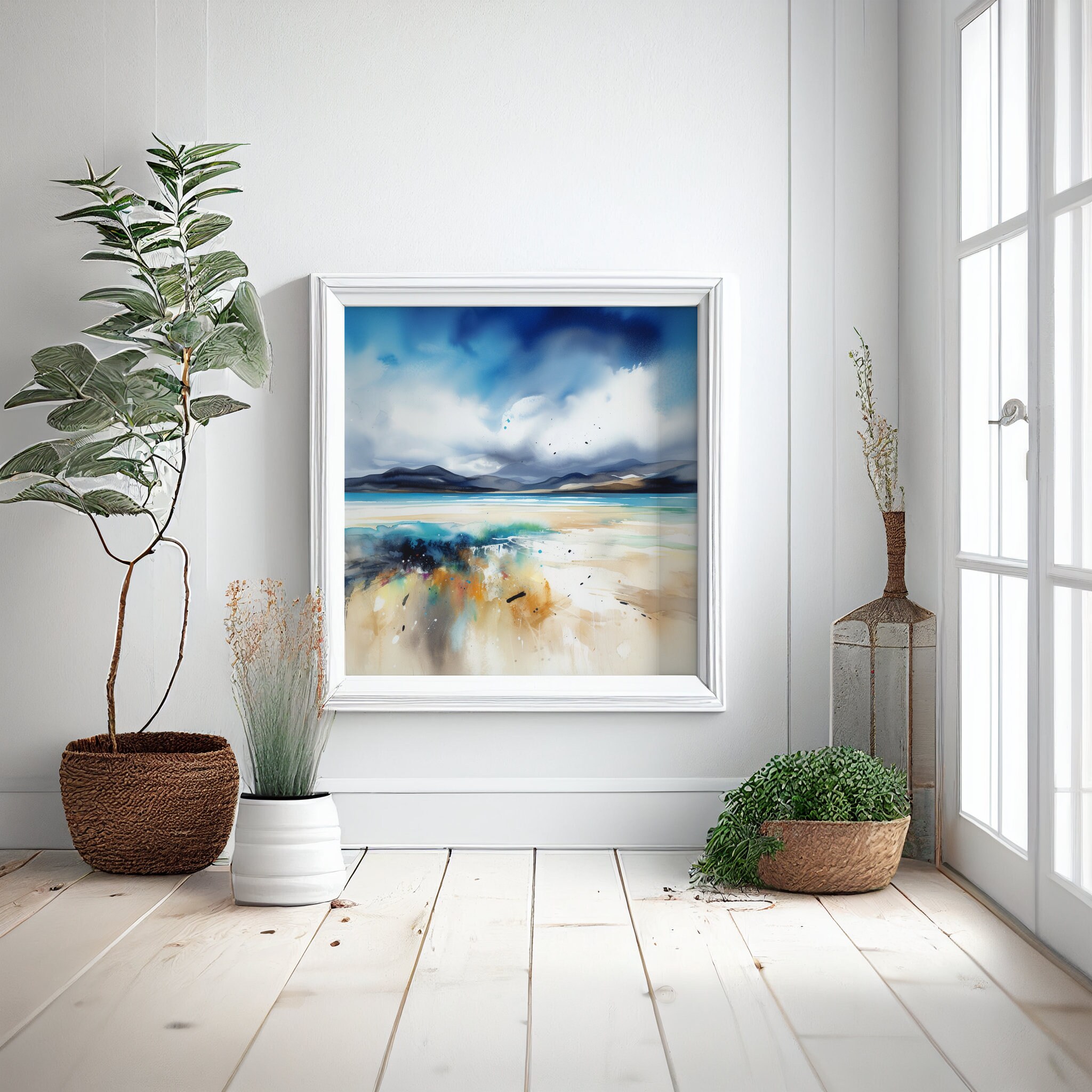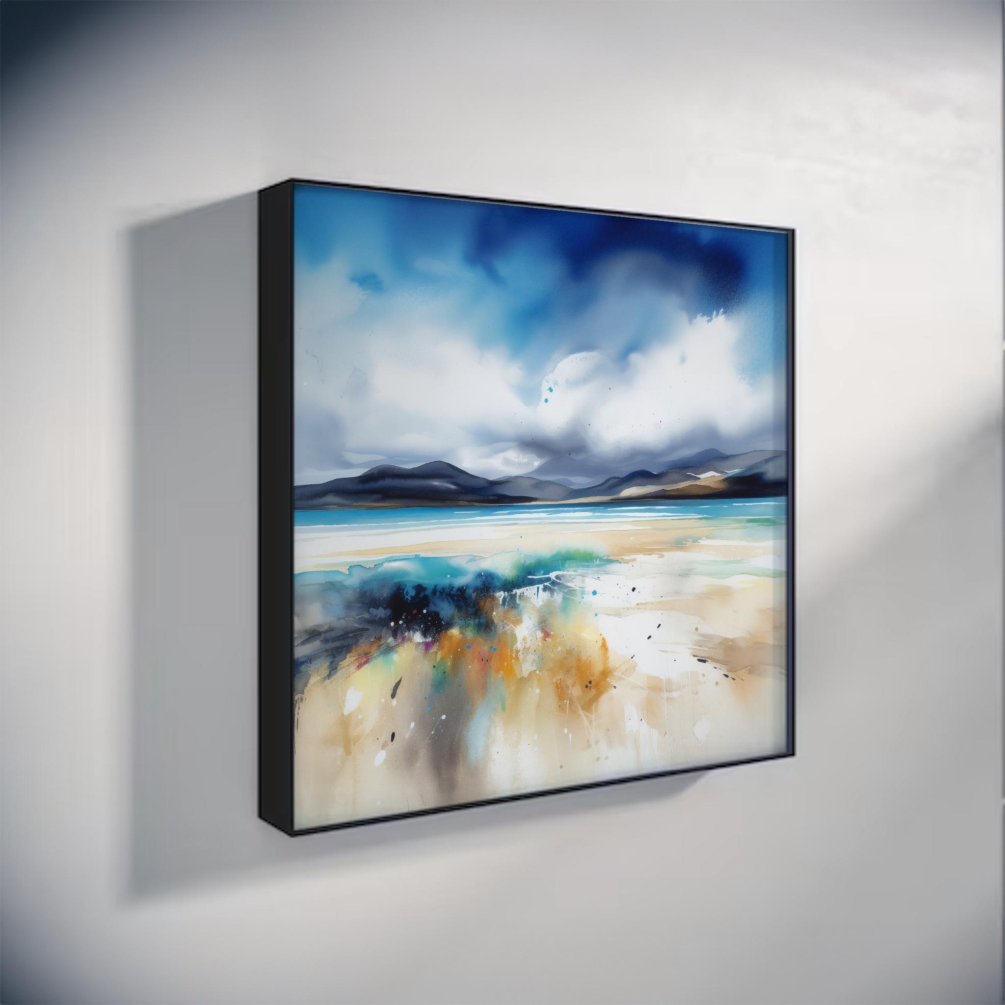 Abstract Scottish Landscape Painting - Print of the Luskentyre Sands, Isle of Harris Scotland. An abstract landscape print of the original Luskentyre Sands Painting. These high-quality prints are produced on premium heavyweight watercolour paper, giving them a textured and authentic feel. The vibrant colours, broad brushstrokes and intricate details of the painting are sure to make a statement in any room. An ideal gift for any nature lover, or as a treat for yourself.