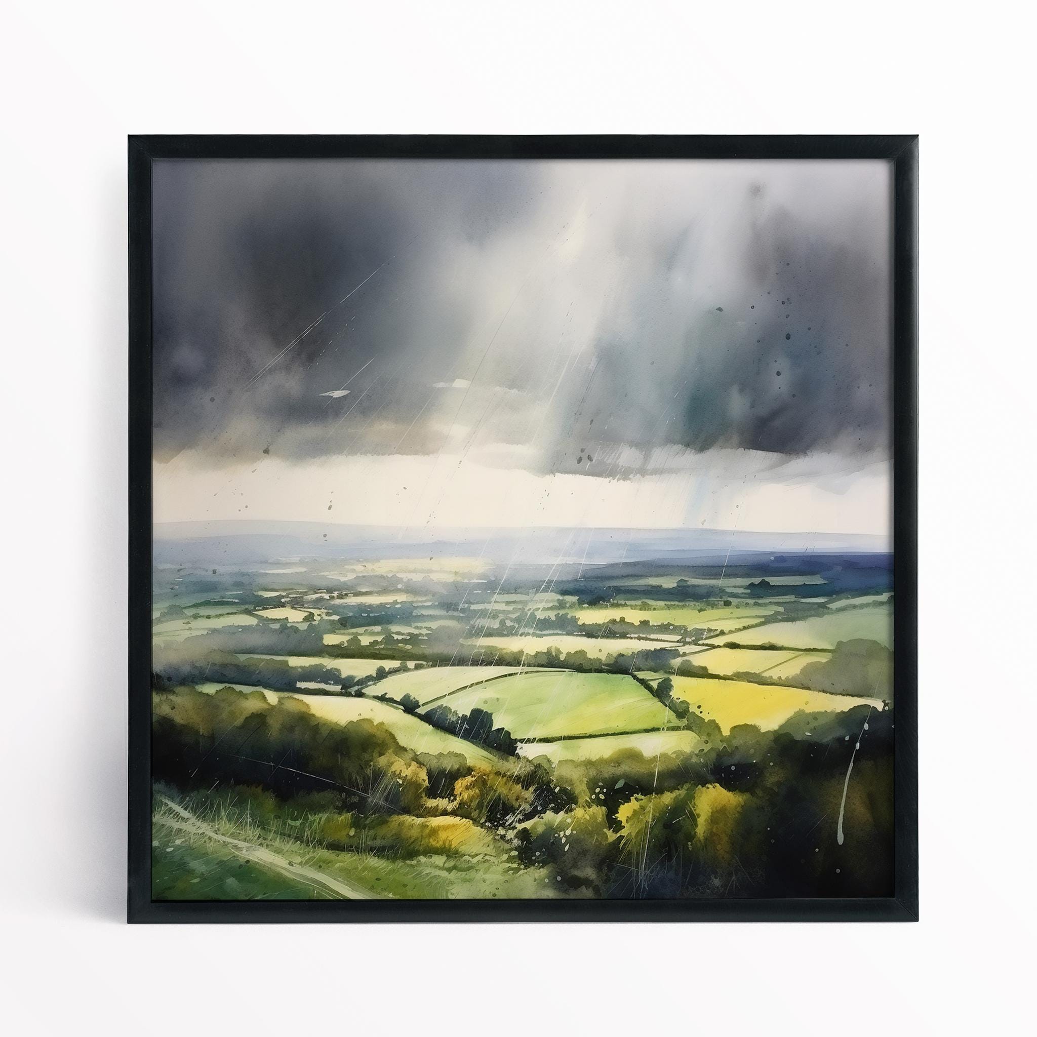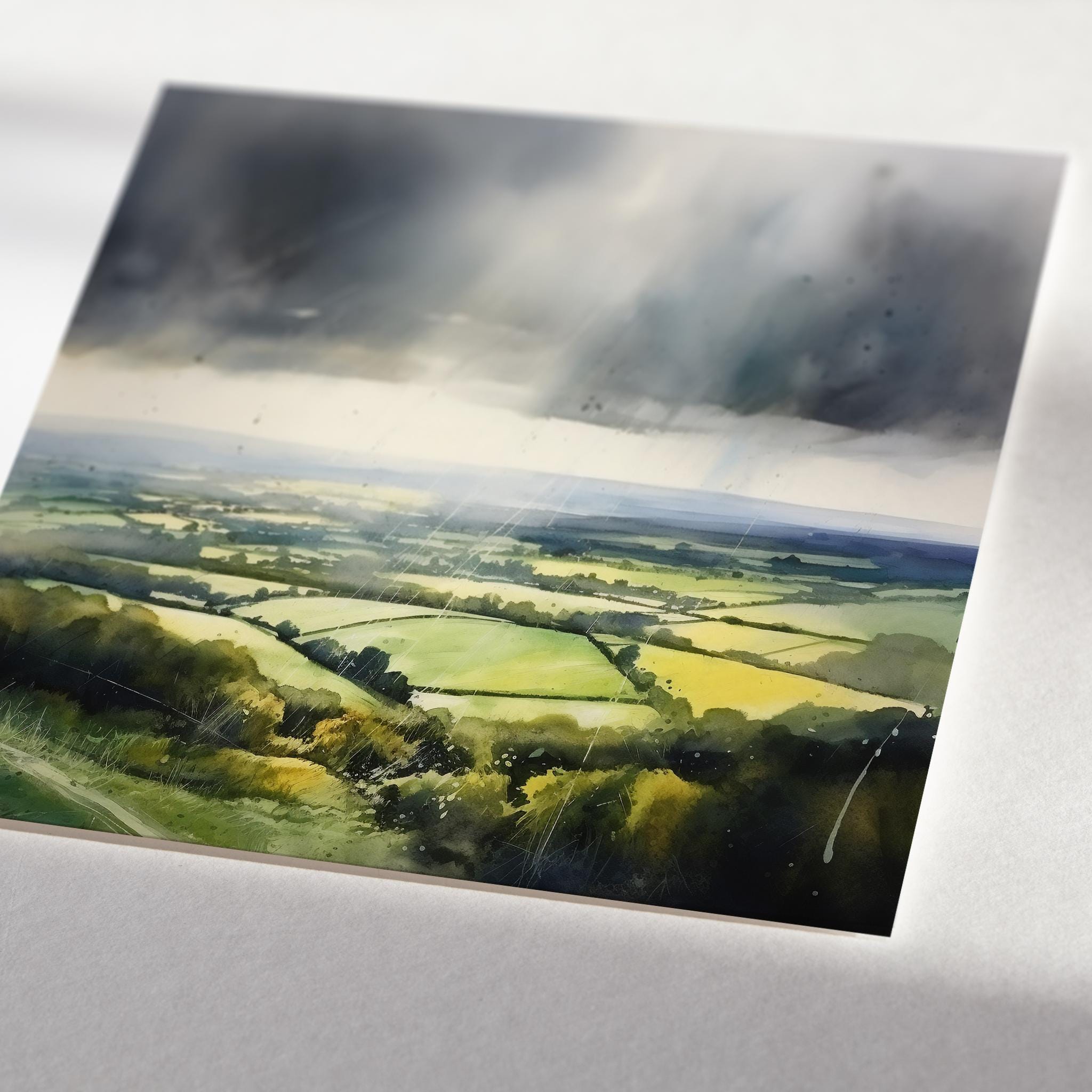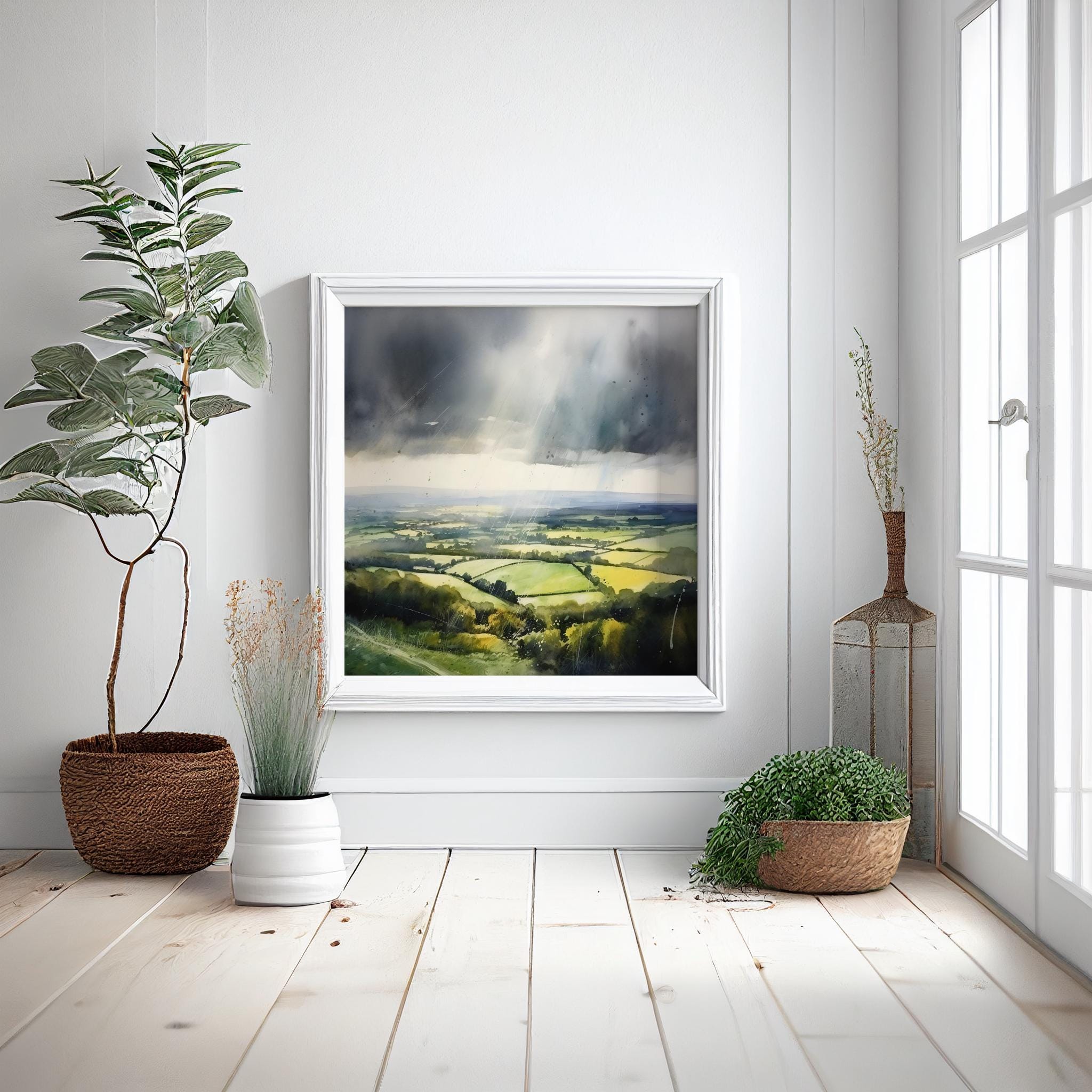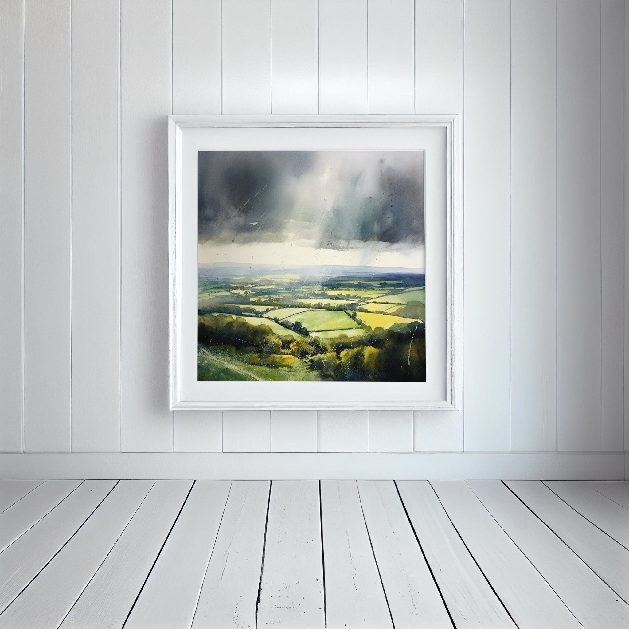 An abstract landscape print of Fields of Wheat after a Storm in the Southdowns National Park. High-quality prints produced on premium heavyweight watercolour paper or canvas, giving them a textured and authentic feel. The vibrant colours, broad brushstrokes and intricate details of the painting are sure to make a statement in any room. An ideal gift for any nature lover, or as a treat for yourself.