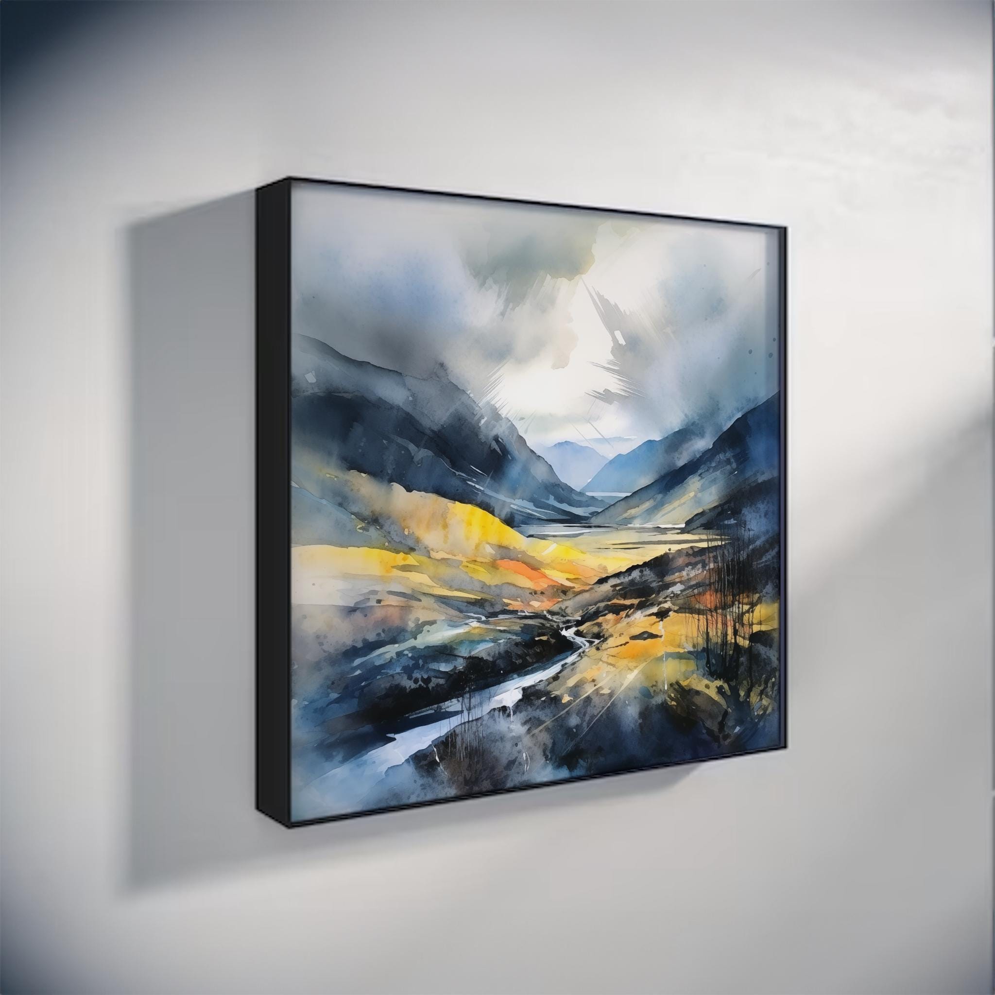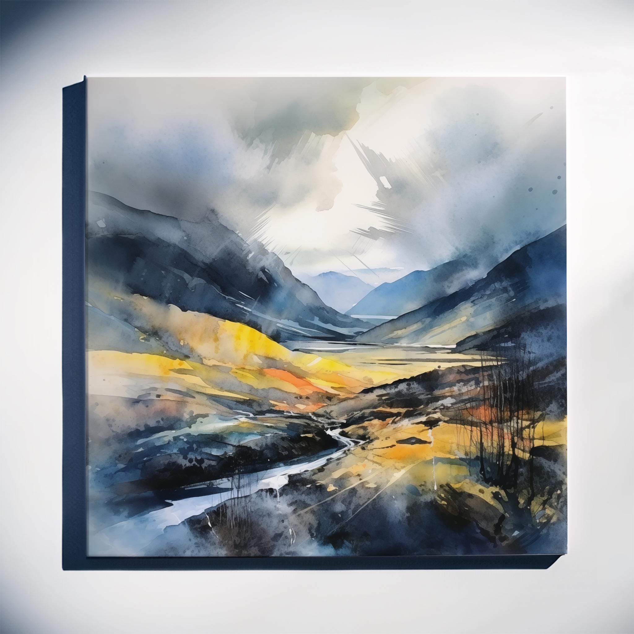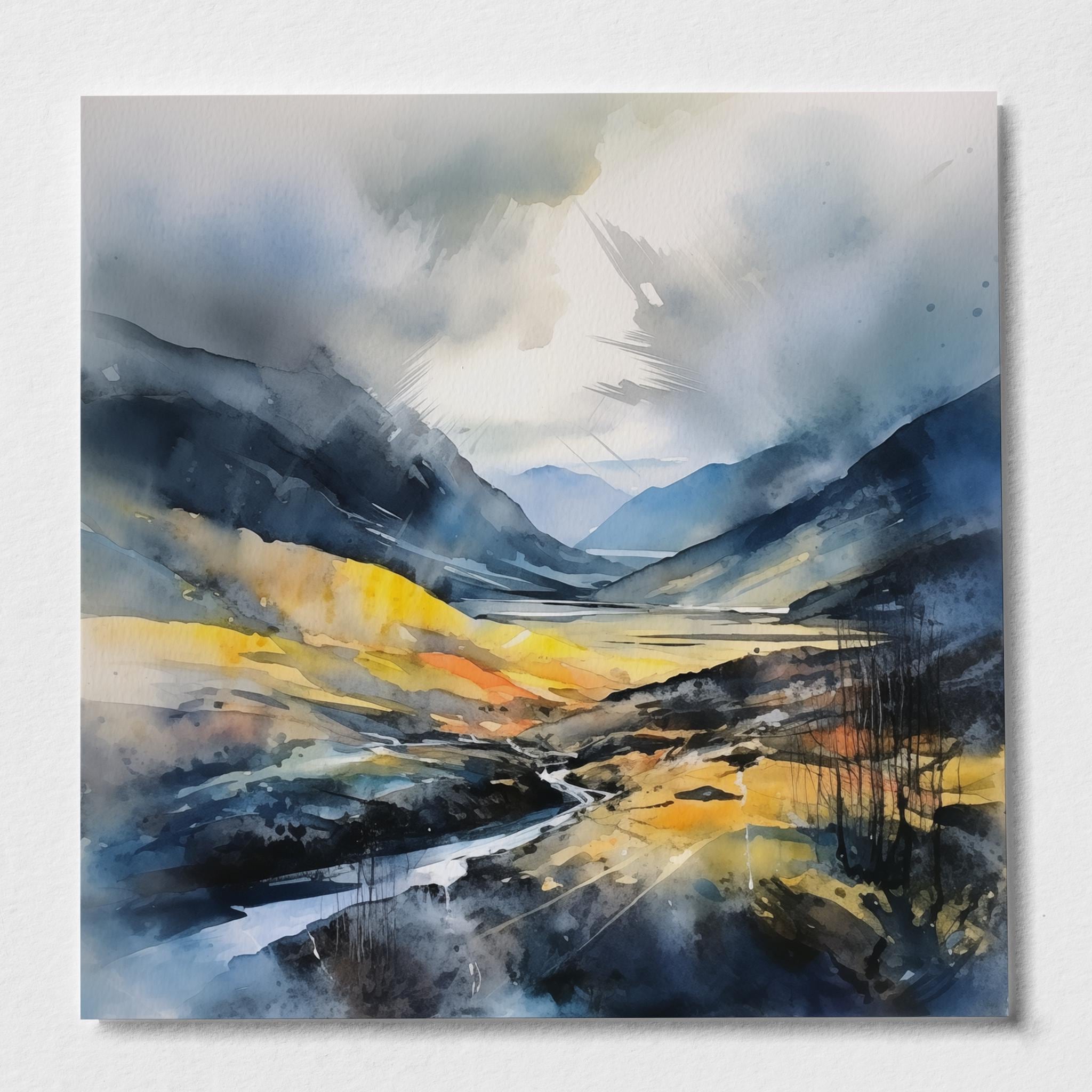 Scottish Landscape Painting of the Highlands of Scotland. An modern abstract landscape print of the original Scottish Landscape Painting. These high-quality prints are produced on premium heavy weight watercolour paper, giving them a textured and authentic feel. The vibrant colours, broad brushstrokes and intricate details of the painting are sure to make a statement in any room. An ideal gift for any nature lover, or as a treat for yourself.