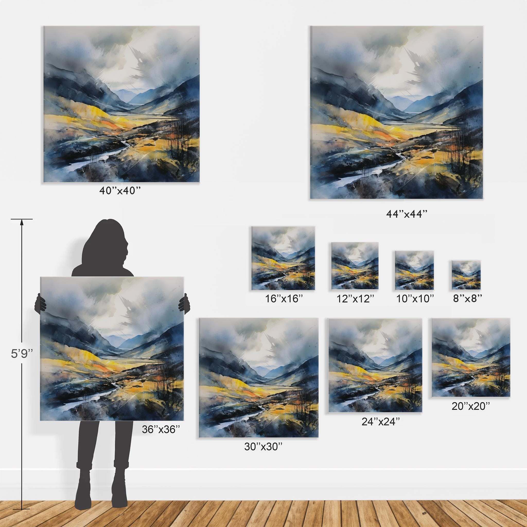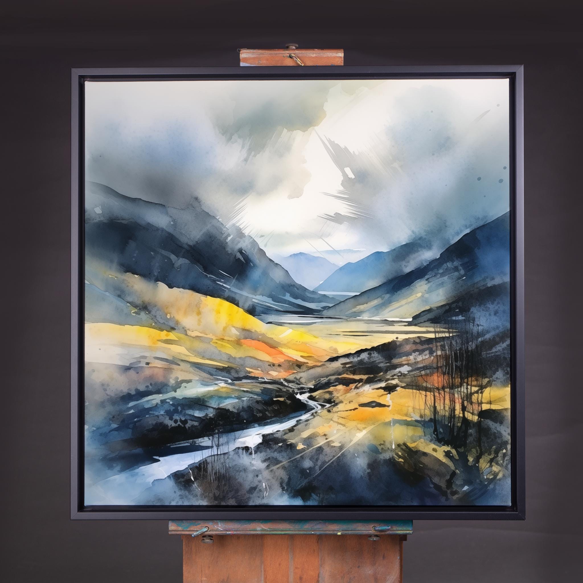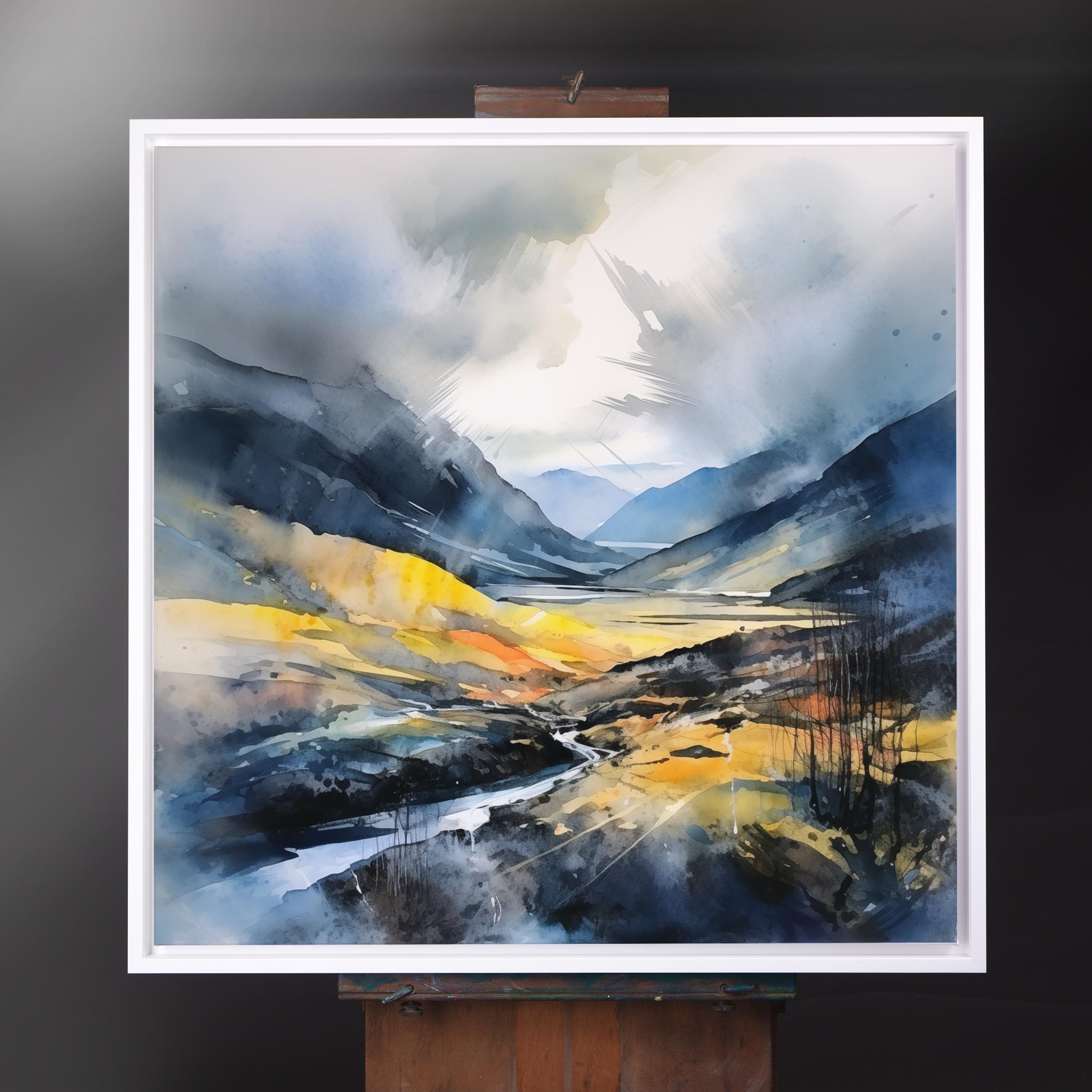 Scottish Landscape Painting of the Highlands of Scotland. An modern abstract landscape print of the original Scottish Landscape Painting. These high-quality prints are produced on premium heavy weight watercolour paper, giving them a textured and authentic feel. The vibrant colours, broad brushstrokes and intricate details of the painting are sure to make a statement in any room. An ideal gift for any nature lover, or as a treat for yourself.