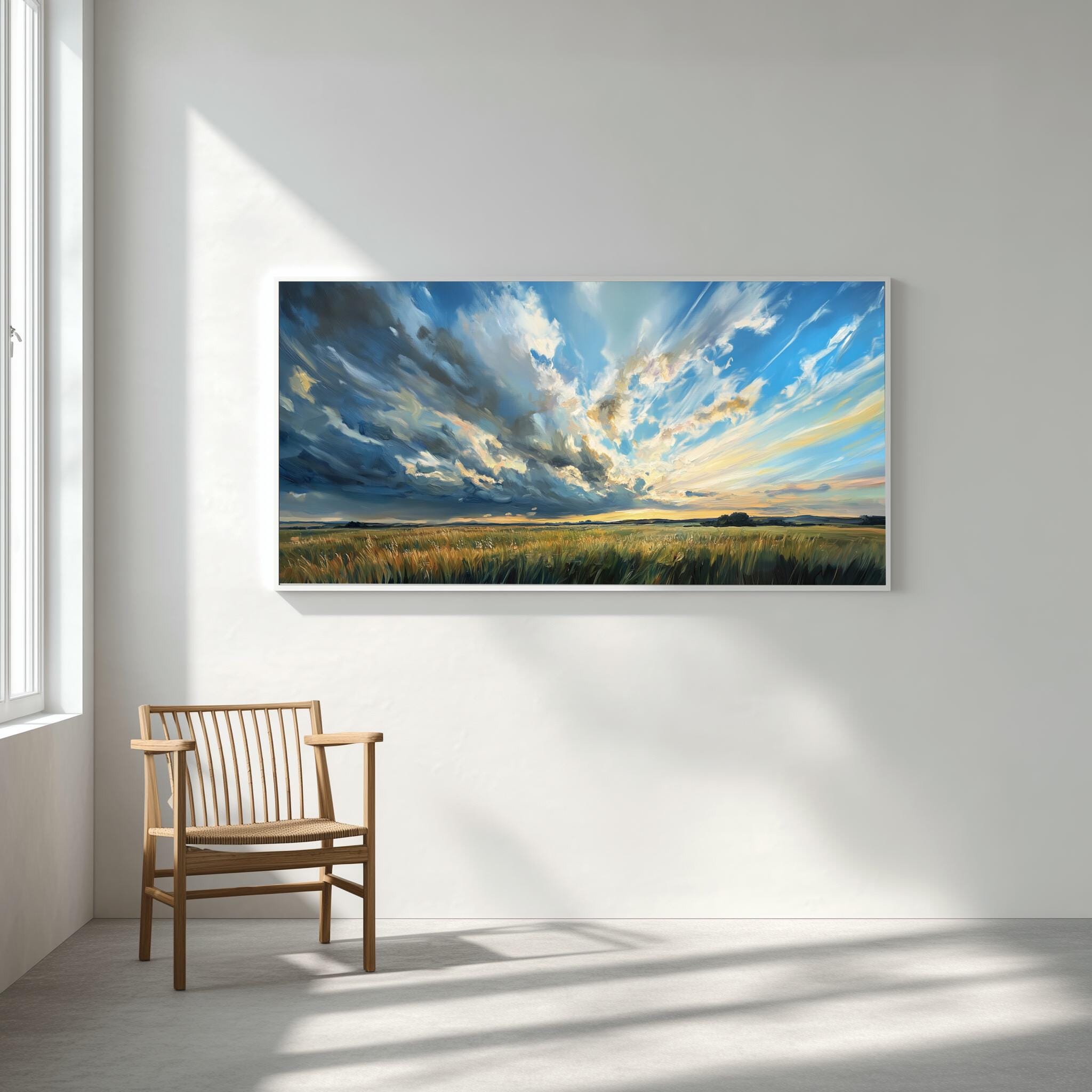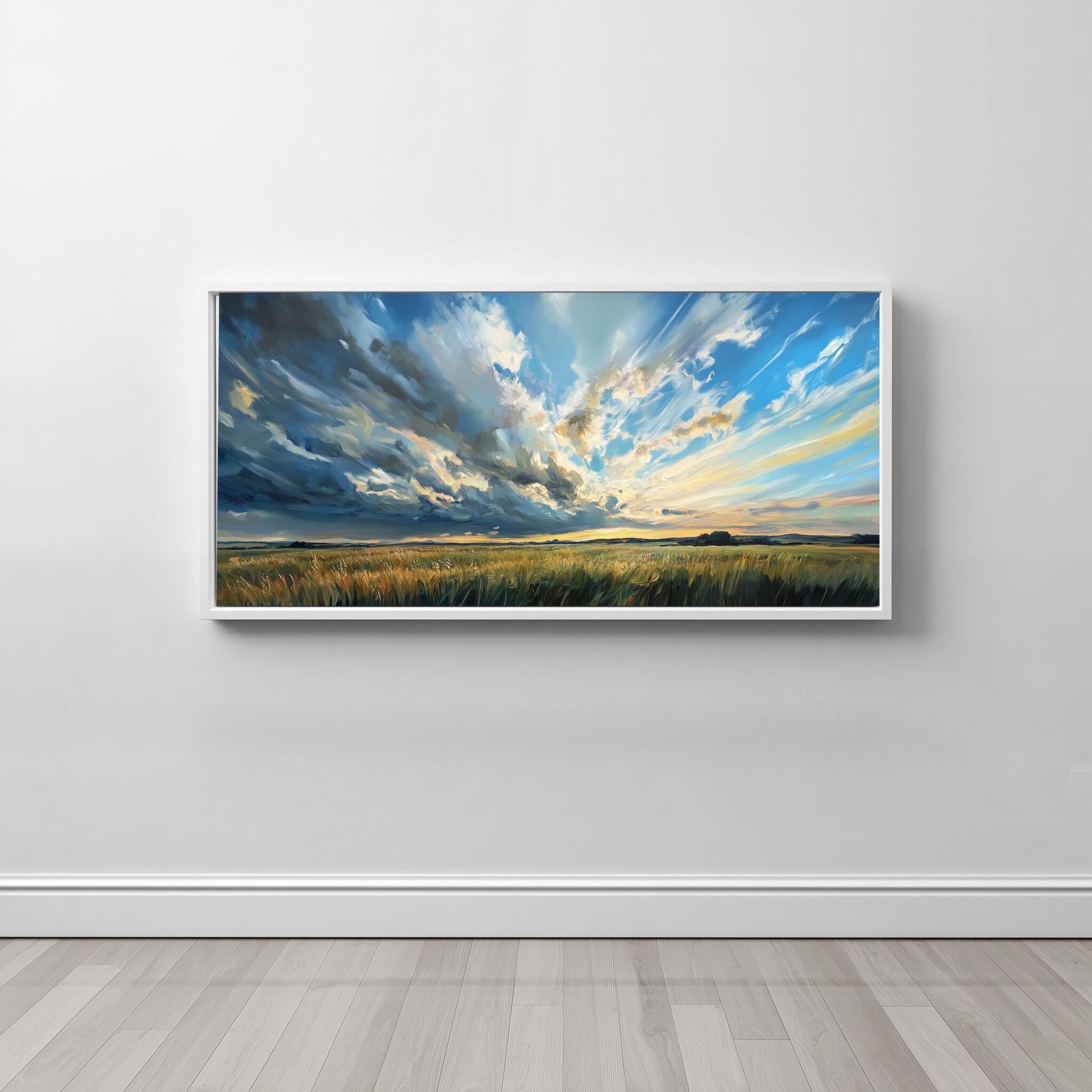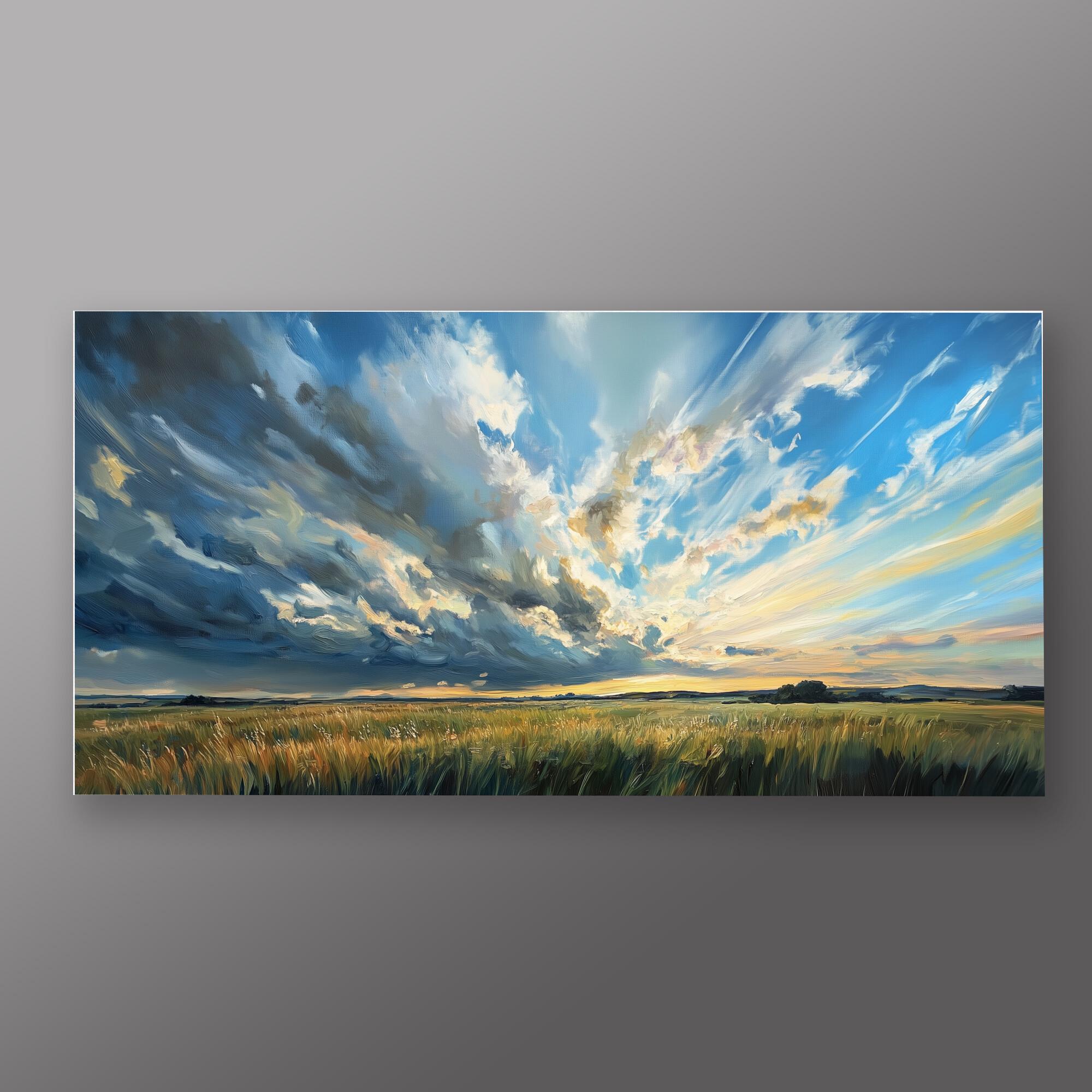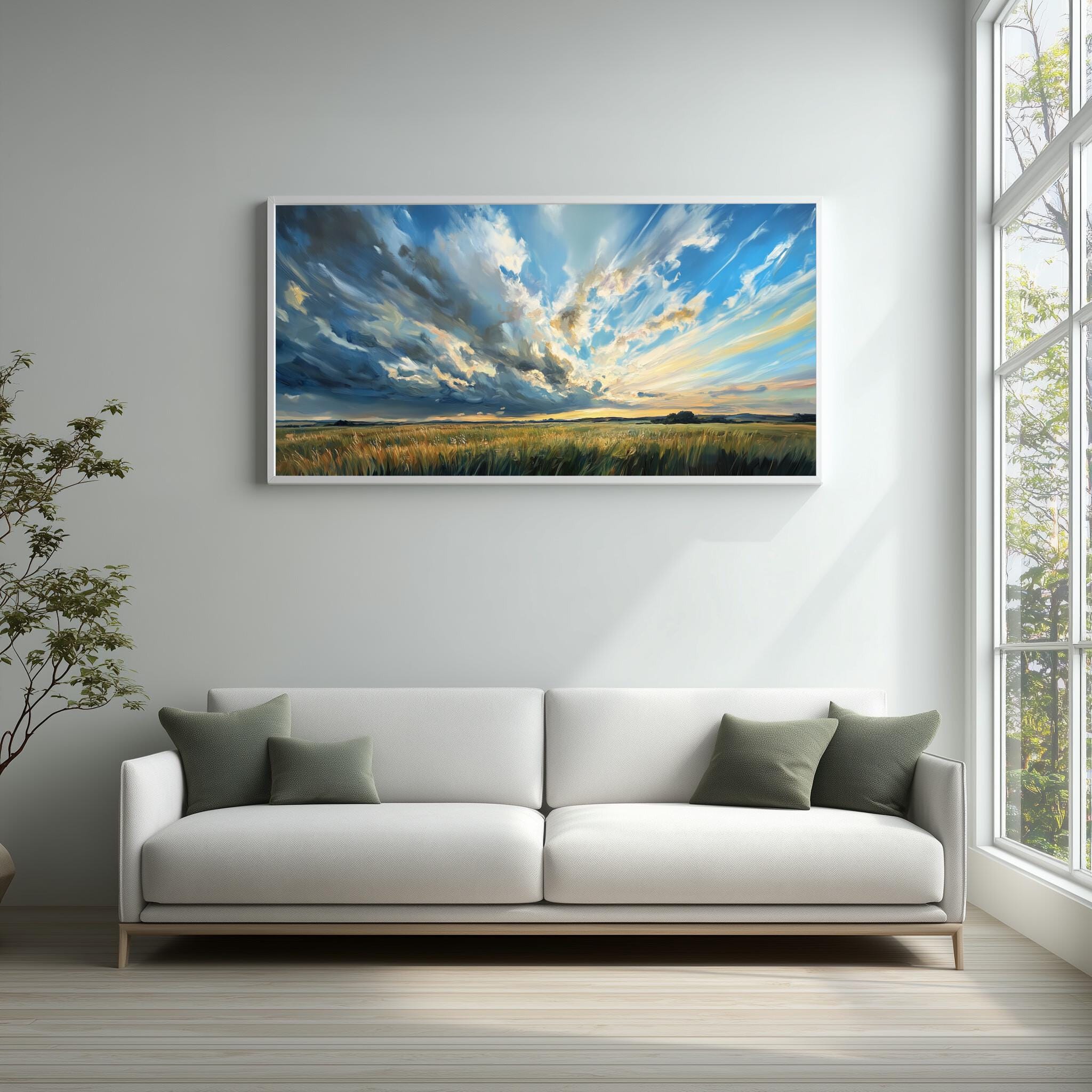 This stunning impressionist artwork captures the essence of a Sussex wheat field beneath an expansive and dynamic blue sky. With warm tones and subtle yellow accents, the painting conveys a sense of serenity and natural beauty. Perfectly suited for those who appreciate landscapes and the charm of countryside scenes.