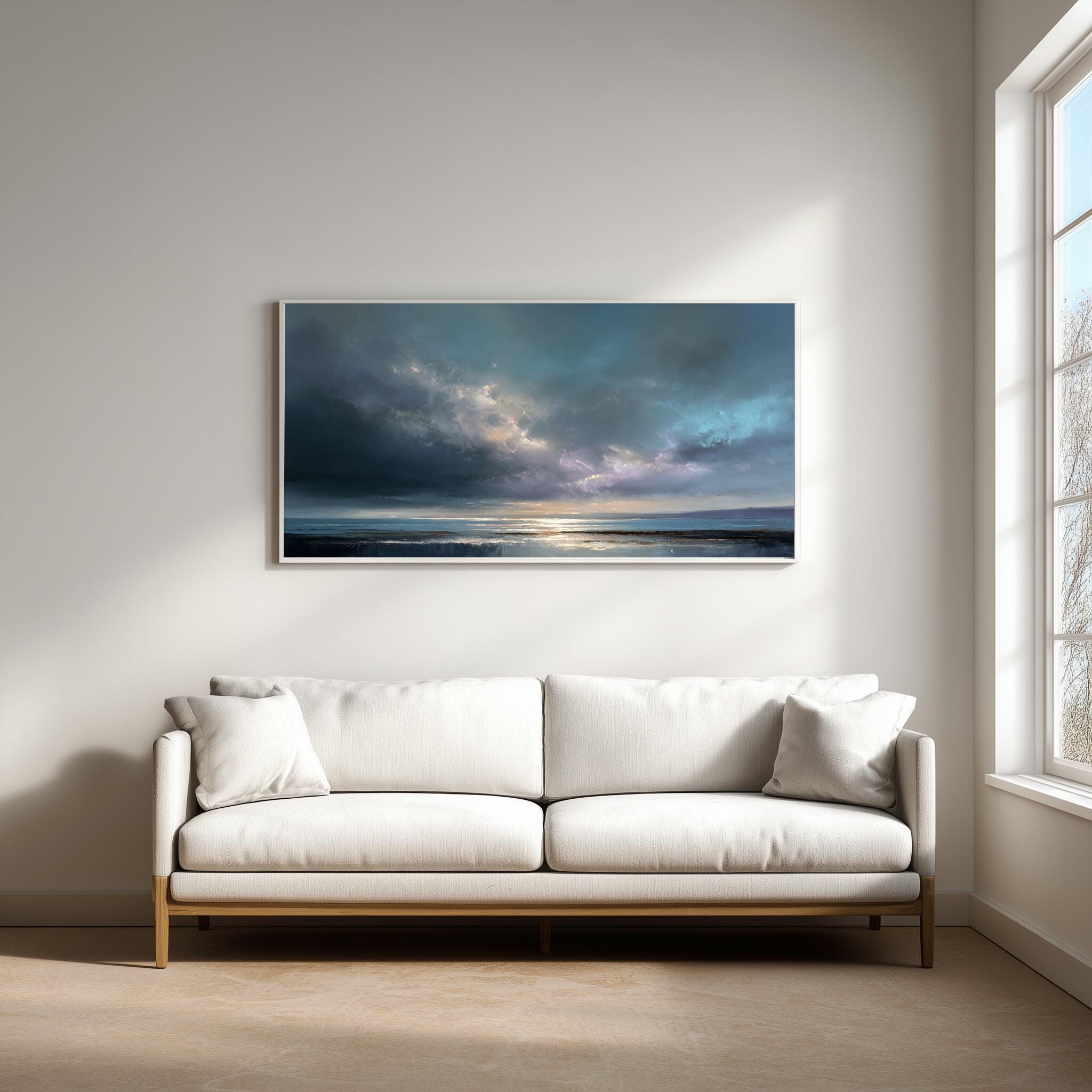 The gentle blend of blues and warm undercurrents creates a relaxing atmosphere, perfect for your living room or bedroom decor. Its soothing palette and abstract style also make it a versatile choice for office art, allowing a touch of nature's calm in your workspace.