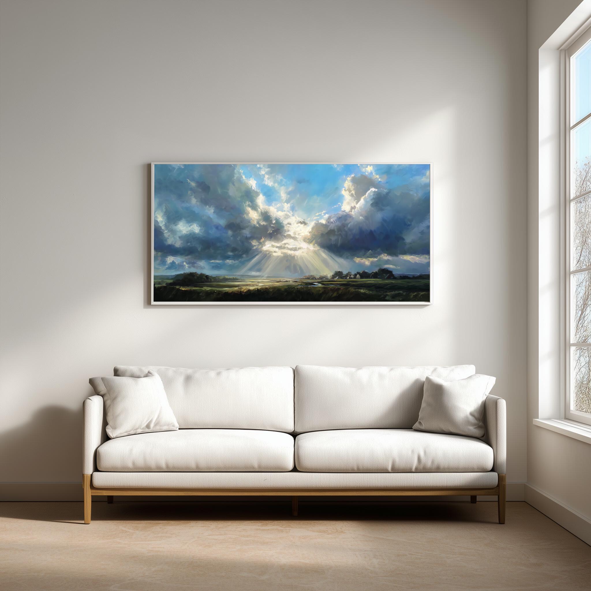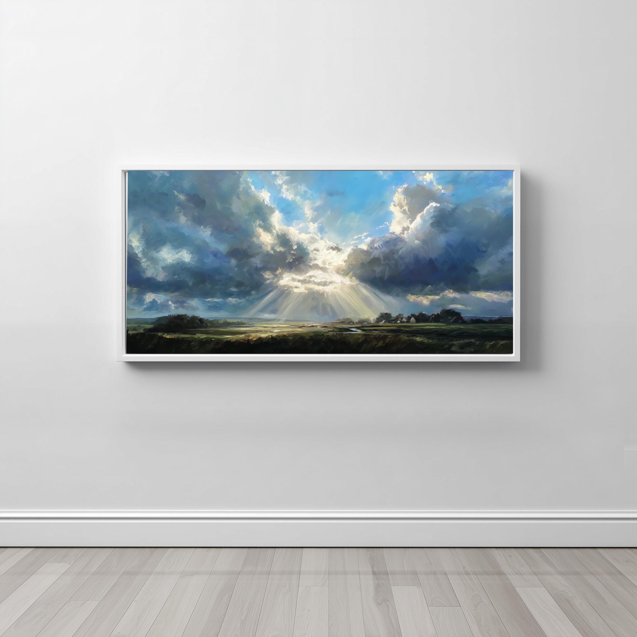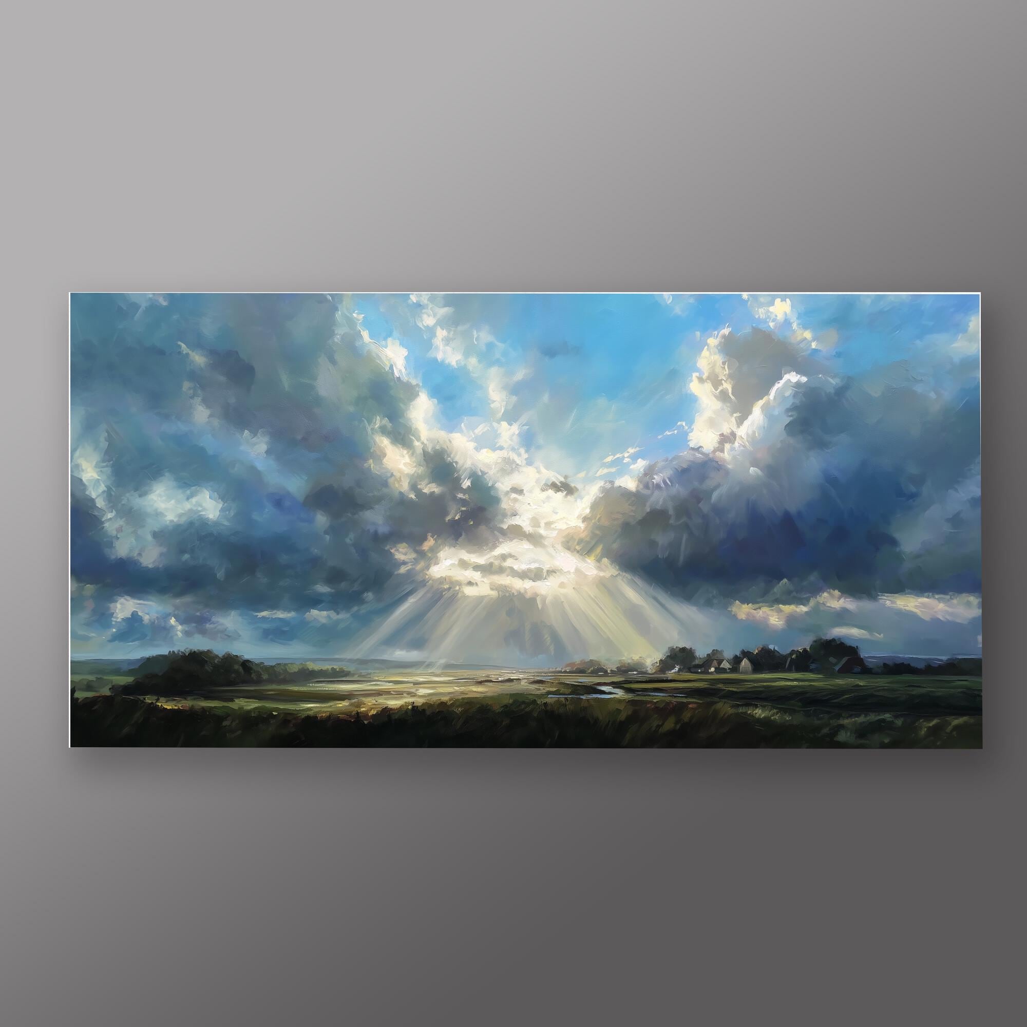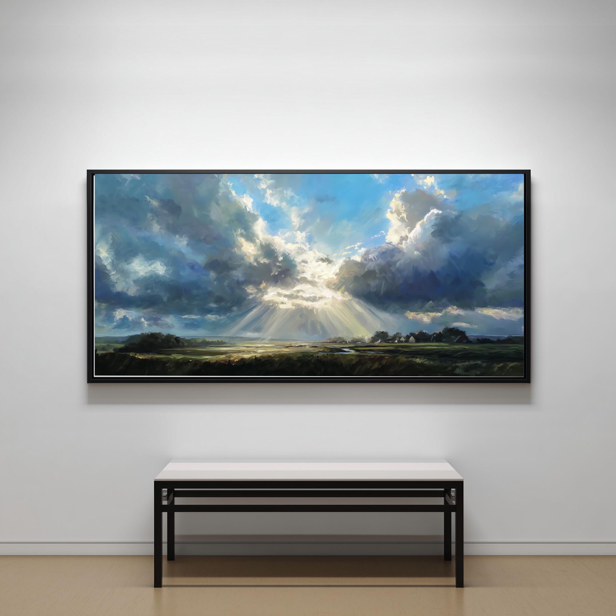 Experience the serene beauty of the Sussex countryside with this captivating impressionist landscape artwork. Dominated by a magnificent blue sky, the scene portrays dramatic clouds and sunbeams illuminating the verdant land below, capturing the essence of pastoral charm.