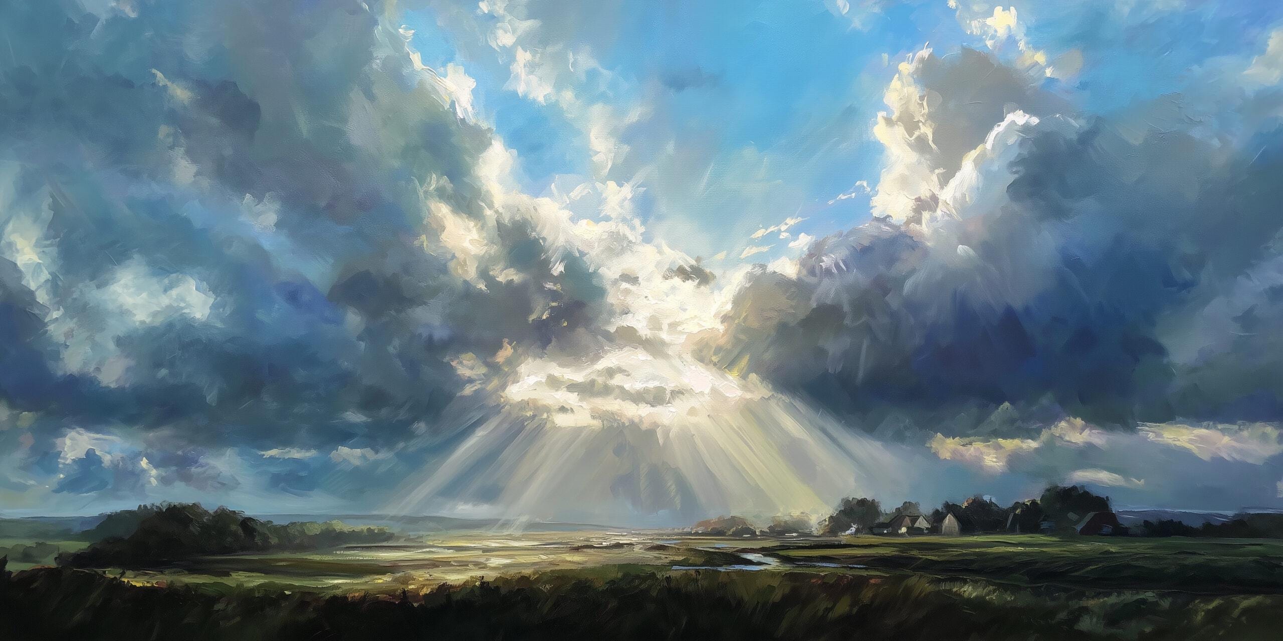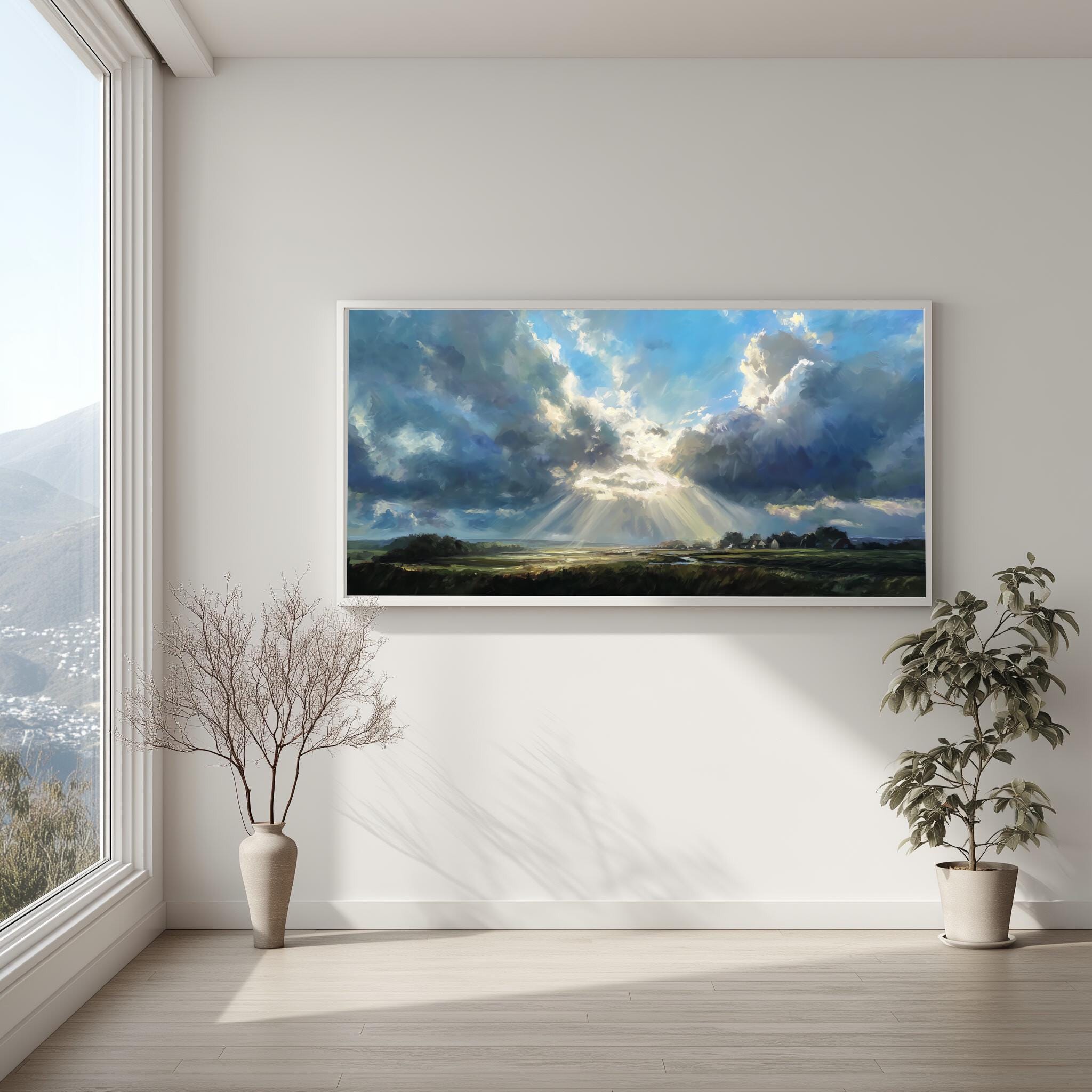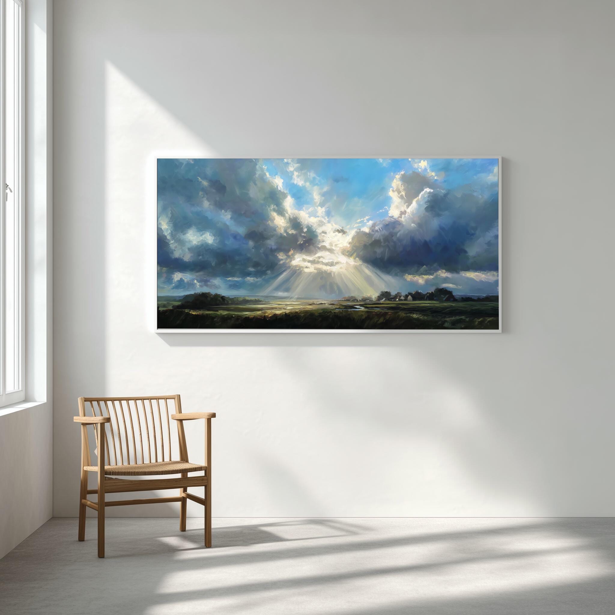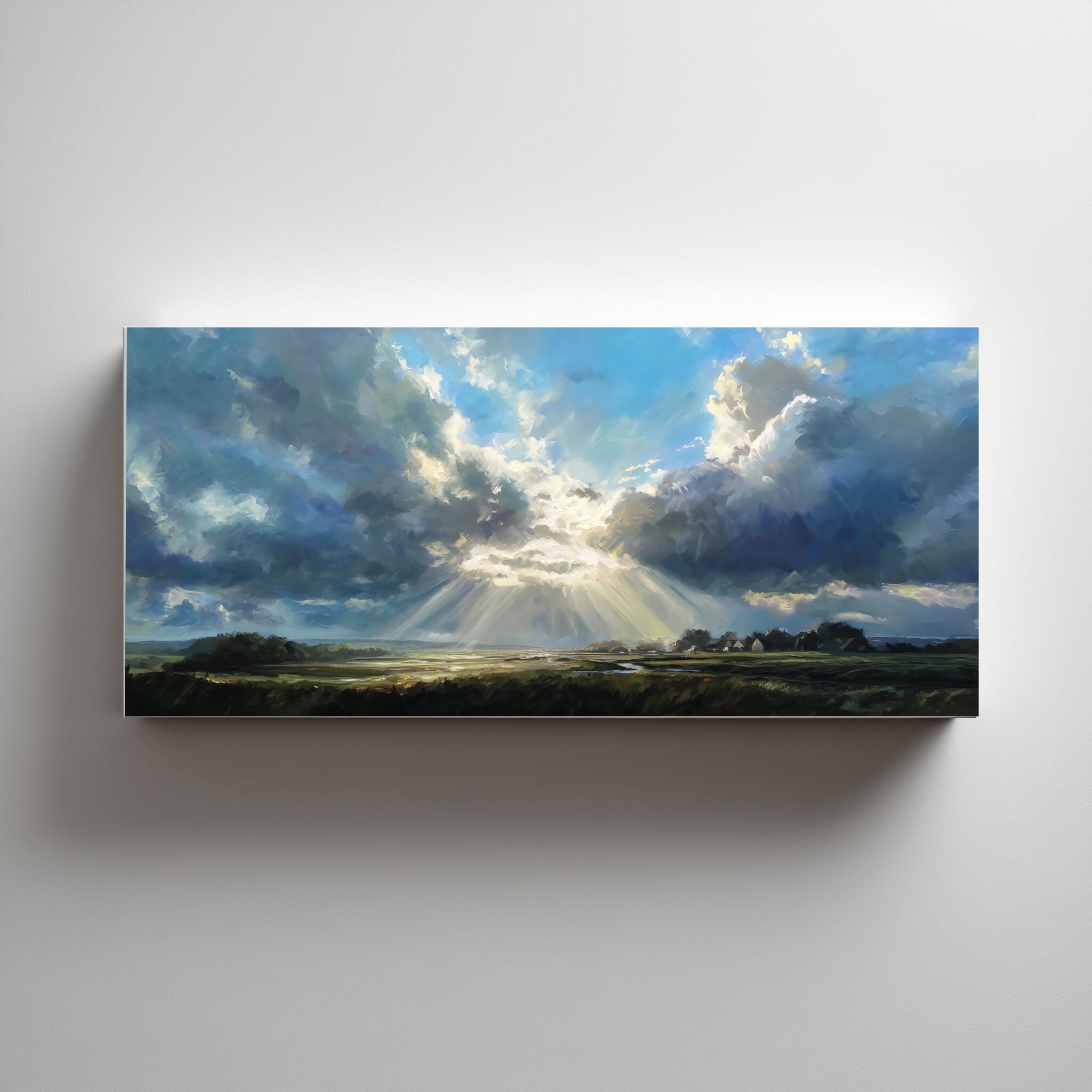 Experience the serene beauty of the Sussex countryside with this captivating impressionist landscape artwork. Dominated by a magnificent blue sky, the scene portrays dramatic clouds and sunbeams illuminating the verdant land below, capturing the essence of pastoral charm.