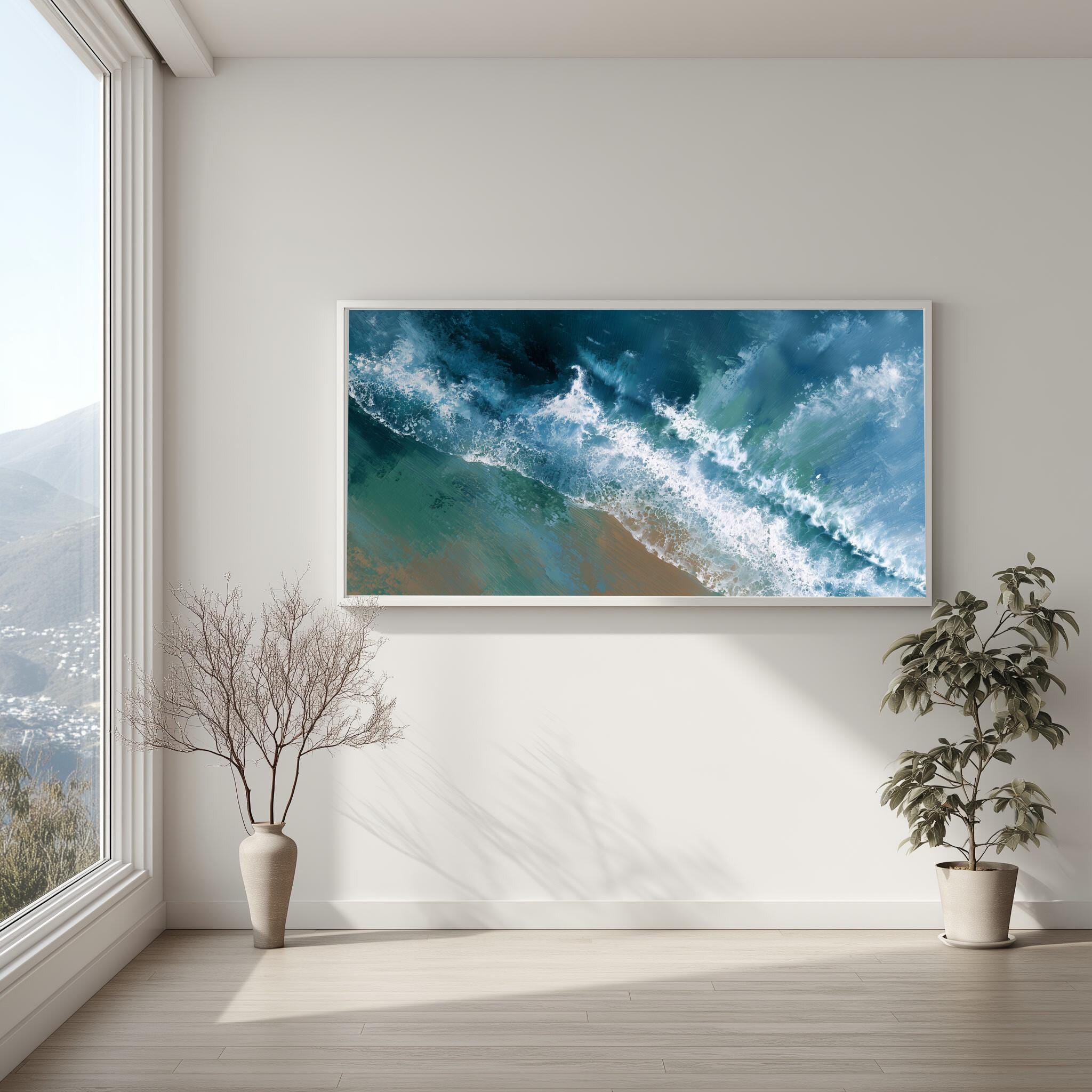 Experience the dynamic allure of 'Waves From Above', capturing the essence of Cornwall's majestic ocean adventures. This abstract piece, rich in blue art tones, brings the energy and beauty of ocean waves into your living space.