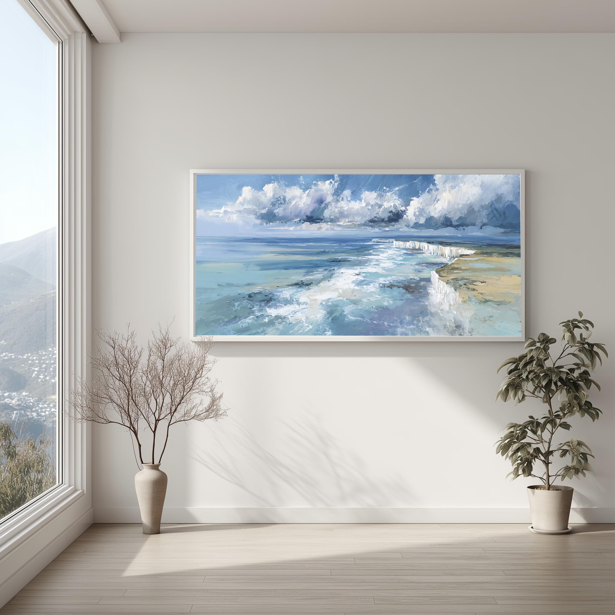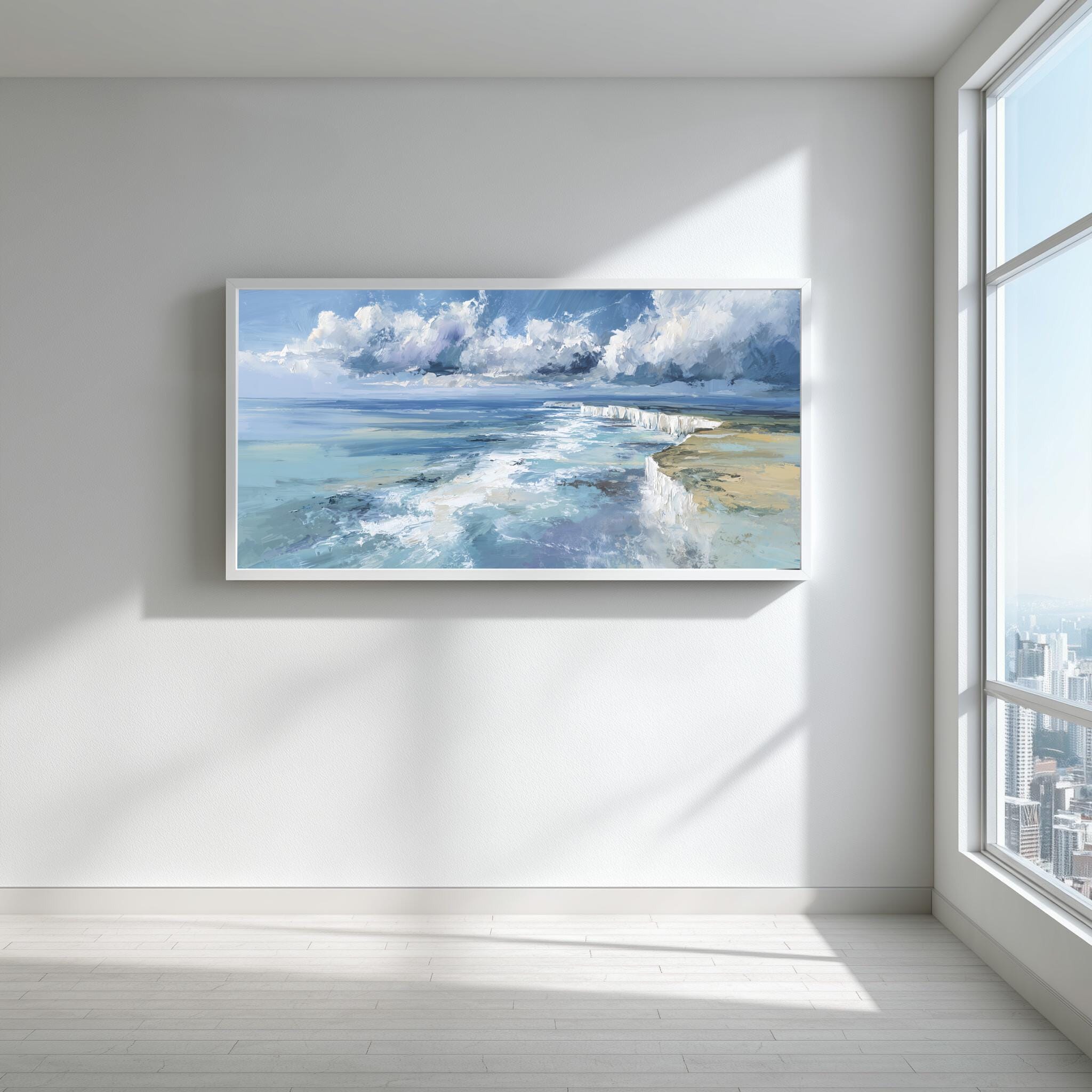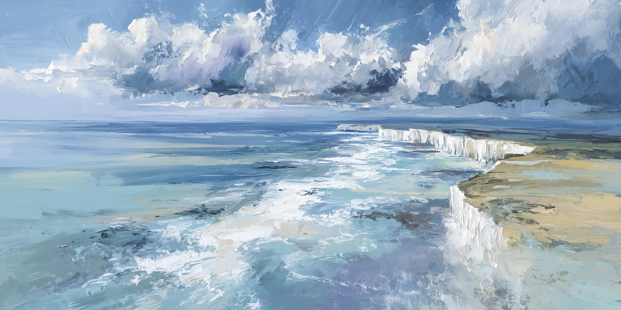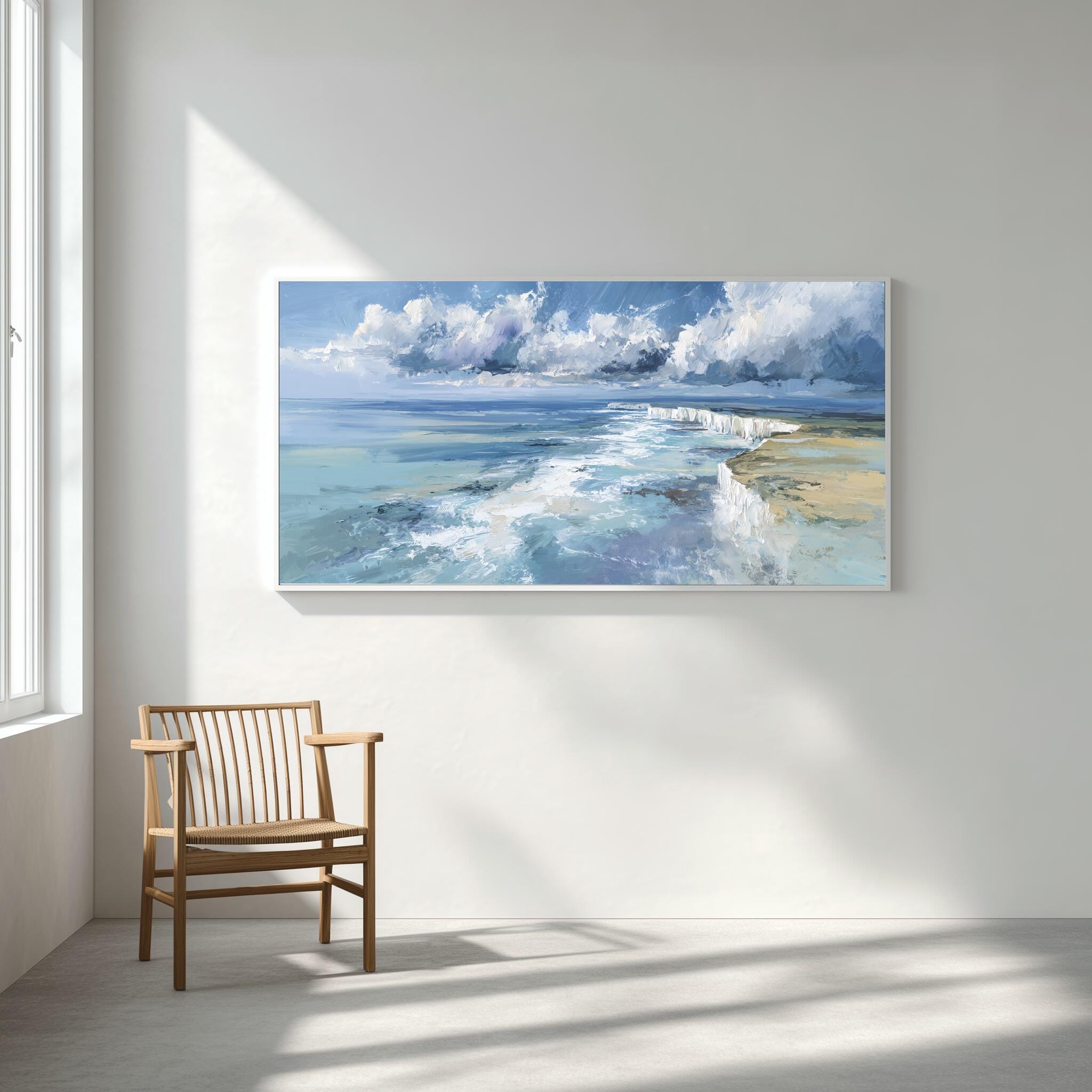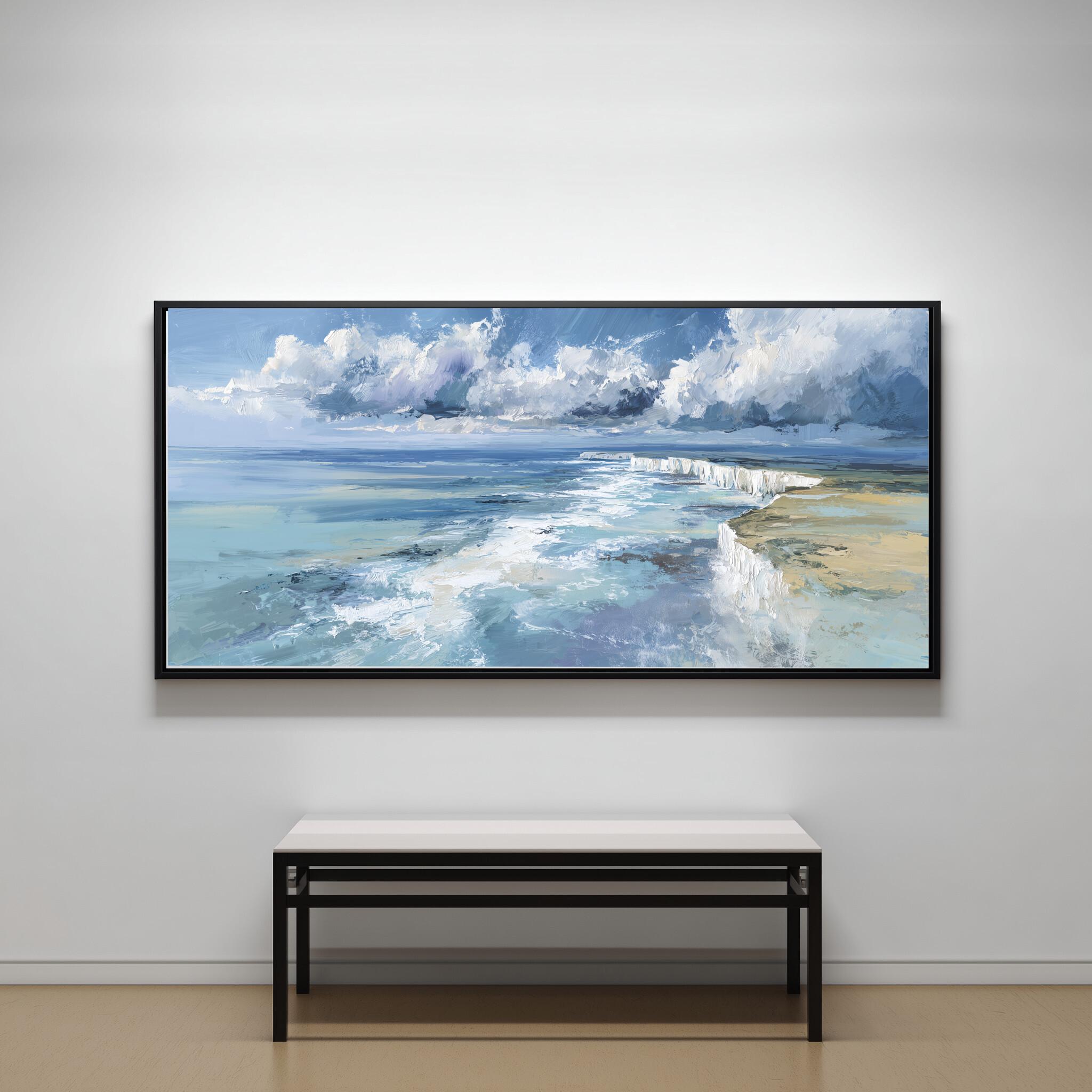 Discover the serene beauty of Birling Gap cliffs through this captivating impressionist artwork. Dominated by calming blue tones, the piece captures the essence of the coastal landscape with its sweeping horizon and gentle sea spray. The artwork’s soft brushstrokes bring a sense of tranquility and movement, making it a stunning addition to any art catalogue.