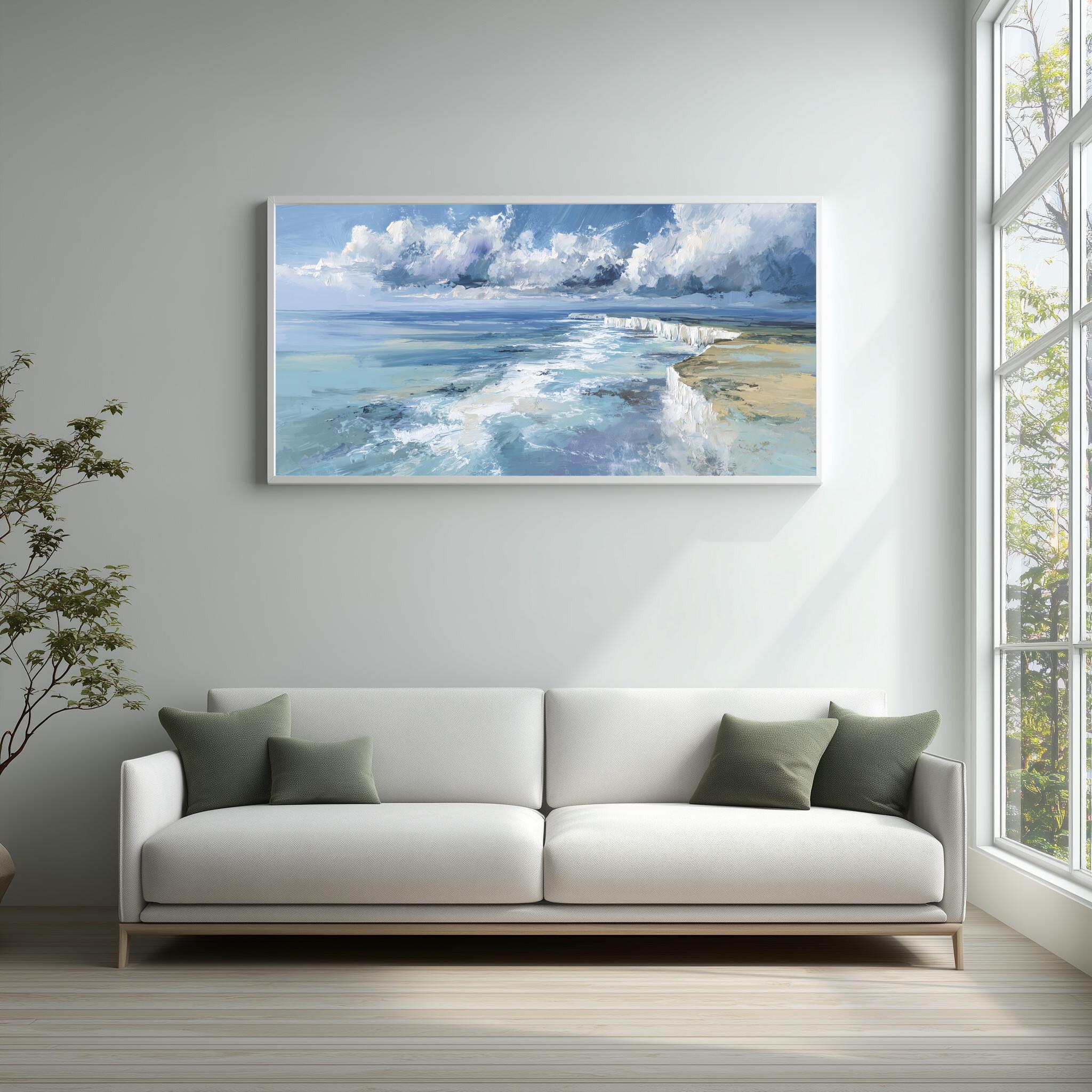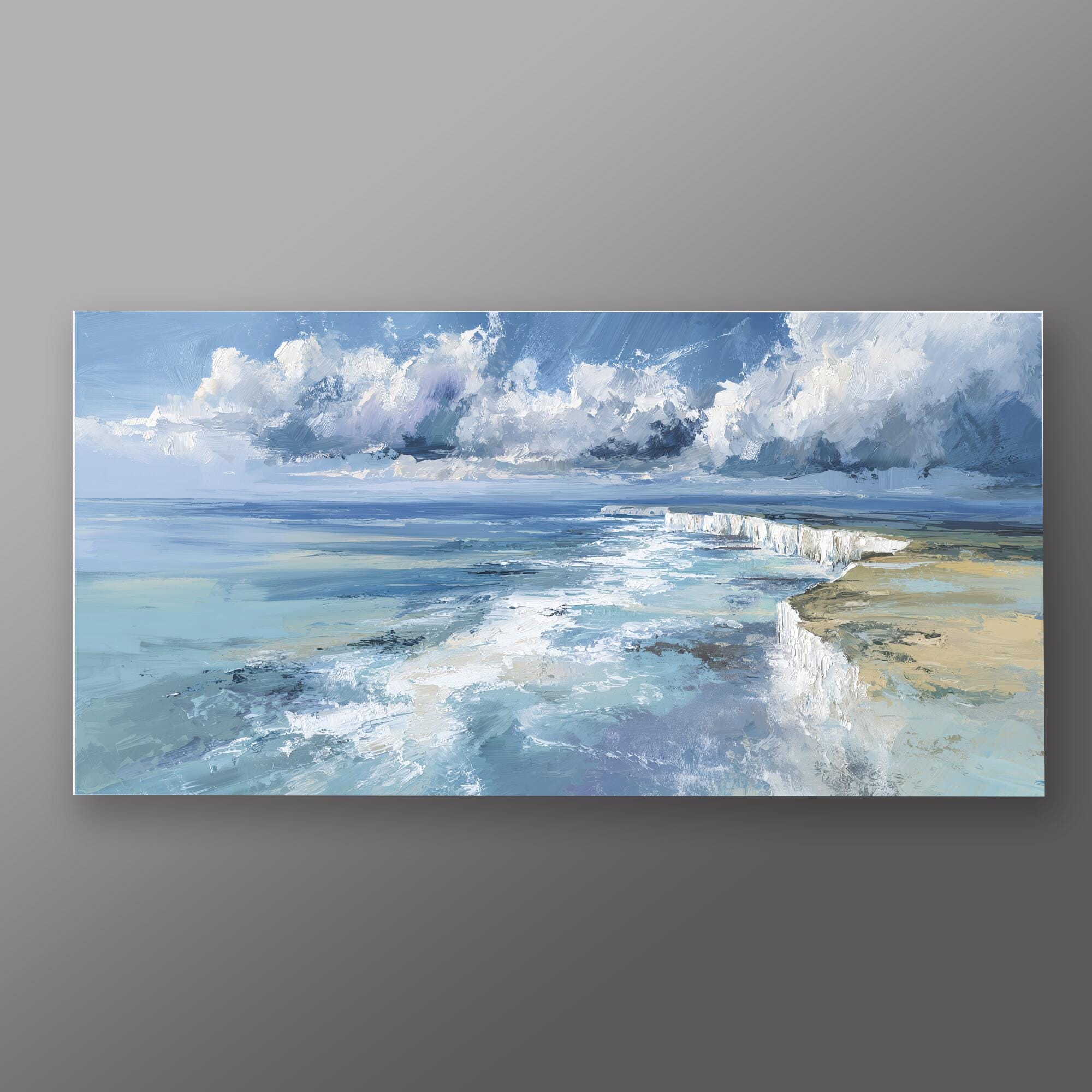 This piece evokes a sense of peace and reflection, ideally suited for your living room, bedroom, or office art collection. Its calming hues of blue make it a versatile piece that can transform any space into a serene coastal escape. Perfectly balancing between abstract and realism, it's a true statement of elegance and simplicity in home decor.